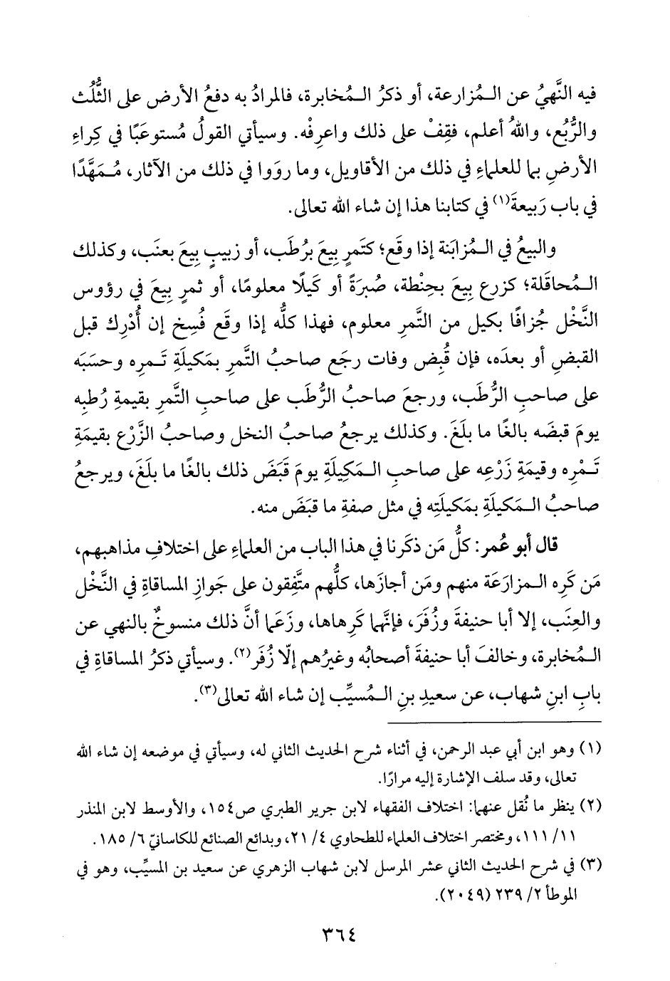 قال أبو عُمر: كلُّ مَن ذكَرنا في هذا الباب من العلماءِ على اختلافِ مذاهبهم، مَن كَرِه المزارَعَة منهم ومَن أجازَها، كلُّهم متَّفِقون على جَوازِ المساقاةِ في النَّخْل والعِنَب، إلا أبا حنيفةَ وزُفَرَ، فإنَّهما كَرِهاها، وزَعَما أنَّ ذلك منسوخ بالنهي عن المُخابرة، وخالفَ أبا حنيفةَ أصحابُه وغيرُهم إلّا زُفَر (¬٢). وسيأتي ذكرُ المساقاةِ في بابِ ابنِ شهاب، عن سعيدِ بنِ المُسيِّب إن شاء الله تعالى (¬٣).