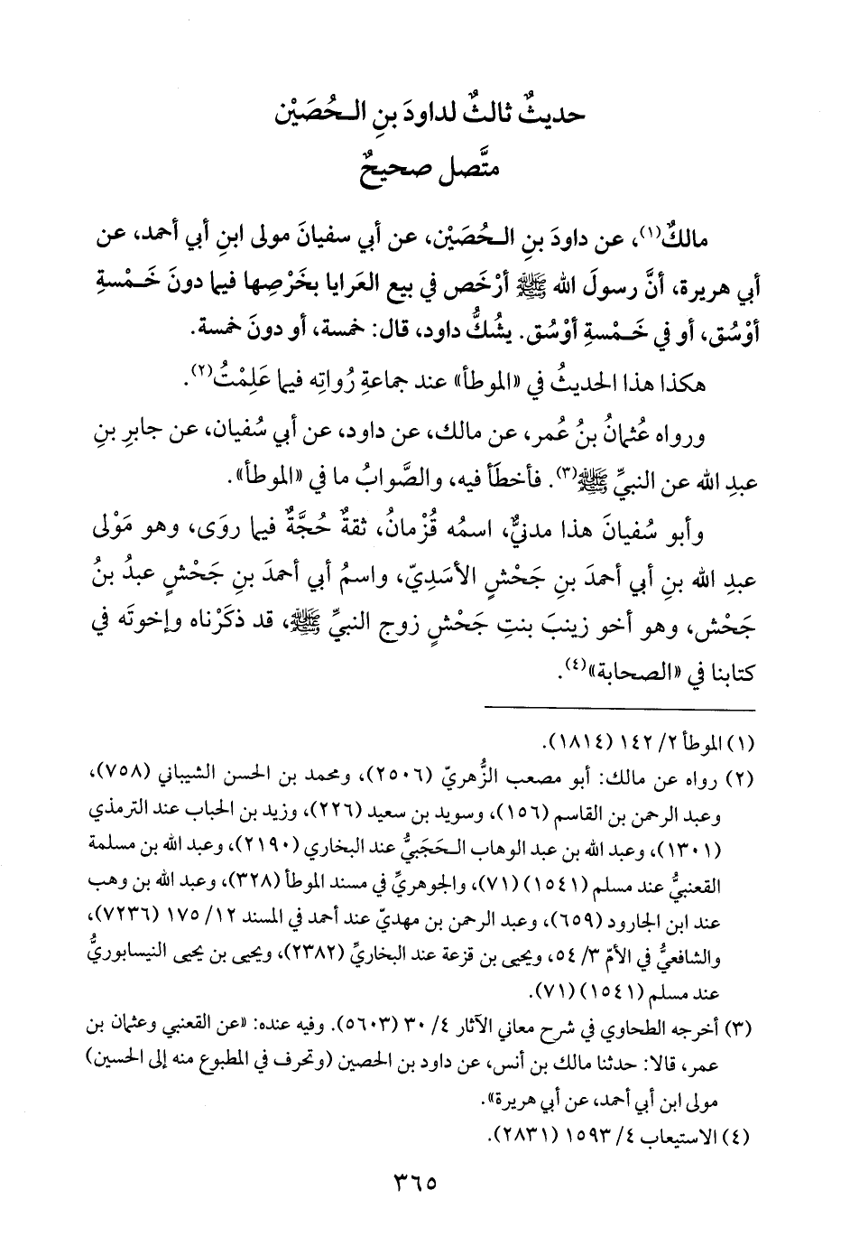 مالكٌ (¬١)، عن داودَ بنِ الحُصَيْن، عن أبي سفيانَ مولى ابنِ أبي أحمد، عن أبي هريرة، أنَّ رسولَ الله - صلى الله عليه وسلم - أرْخَص في بيع العَرايا بخَرْصِها فيما دونَ خَمْسةِ أوْسُق، أو في خَمْسةِ أوْسُق. يشُكُّ داود، قال: خمسة، أو دونَ خمسة.