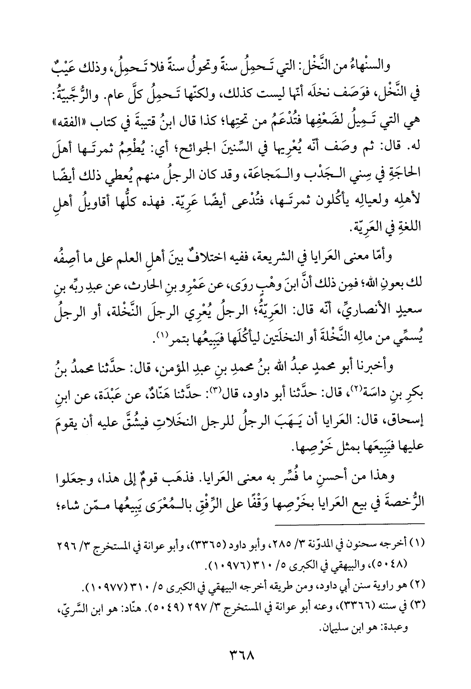 والسنْهاءُ من النَّخْل: التي تَحمِلُ سنةً وتحولُ سنةً فلا تَحمِلُ، وذلك عَيْبٌ في النَّخْل، فوَصَف نخلَه أنّها ليست كذلك، ولكنّها تَحمِلُ كلَّ عام. والرُّجَّبيّةُ: هي التي تَمِيلُ لضعْفِها فتُدْعَمُ من تحتِها؛ كذا قال ابنُ قتيبةَ في كتاب "الفقه" له. قال: ثم وصَف أنّه يُعْرِيها في السِّنينَ الجوائح؛ أي: يُطْعِمُ ثمرتَها أهلَ الحاجَةِ في سِني الجَدْب والمَجاعَة، وقد كان الرجلُ منهم يُعطي ذلك أيضًا لأهلِه ولعيالِه يأكُلون ثمرتَها، فتُدْعى أيضًا عَرِيّة. فهذه كلُّها أقاويلُ أهلِ اللغةِ في العَرِيّة.