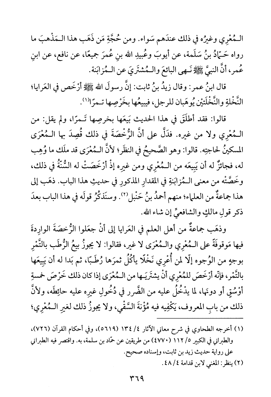 قالوا: فقد أطلَقَ في هذا الحديث بَيعَها بخرصِها تَمرًا، ولم يقل: من المُعْرِي ولا من غيره. فدَلَّ على أنَّ الرُّخْصةَ في ذلك قُصِدَ بها المُعْرَى المسكينُ لحاجتِه. قالوا: وهو الصَّحيحُ في النظَر؛ لأنَّ المُعْرَى قد ملَك ما وُهِب له، فجائزٌ له أن يَبِيعَه من المُعْرِي ومن غيرِه إذْ أرْخَصَتْ له السُّنّةُ في ذلك، وخَصَّتْه من معنى المُزابَنةِ في المقدارِ المذكورِ في حديثِ هذا الباب. ذهَب إلى هذا جماعةٌ من العلماء؛ منهم أحمدُ بنُ حَنْبل (¬٢). وسنَذكُرُ قولَه في هذا الباب بعدَ ذكر قولِ مالكٍ والشافعيِّ إن شاء الله.