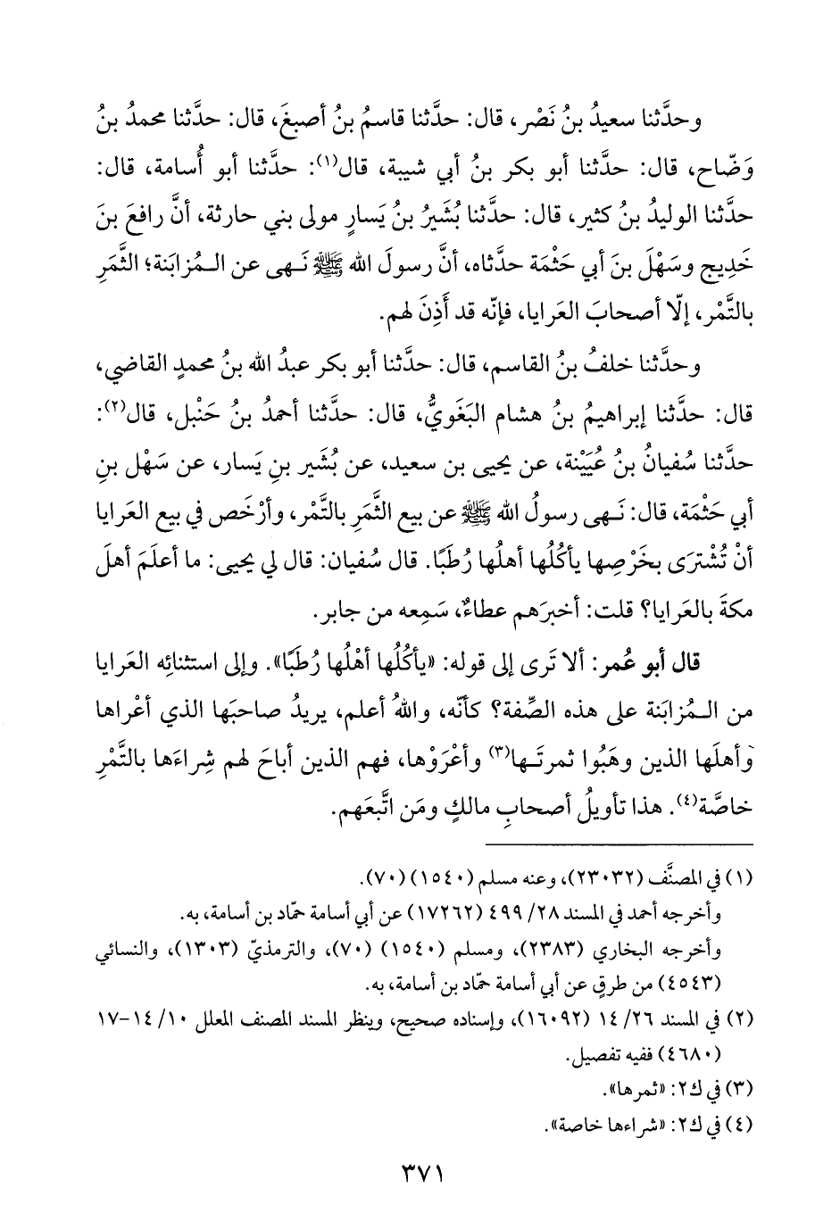 وحدَّثنا سعيدُ بنُ نَصر، قال: حدَّثنا قاسمُ بنُ أصبغَ، قال: حدَّثنا محمدُ بنُ وَضّاح، قال: حدَّثنا أبو بكر بنُ أبي شيبة، قال (¬١): حدَّثنا أبو أُسامة، قال: حدَّثنا الوليدُ بنُ كثير، قال: حدَّثنا بُشَيرُ بنُ يَسارٍ مولى بني حارثة، أنَّ رافعَ بنَ خَدِيج وسَهْلَ بنَ أبى حَثْمَة حدَّثاه، أنَّ رسولَ الله - صلى الله عليه وسلم - نَهى عن المُزابَنة؛ الثَّمَرِ بالتَّمْر، إلّا أصحابَ العَرايا، فإنّه قد أَذِنَ لهم.