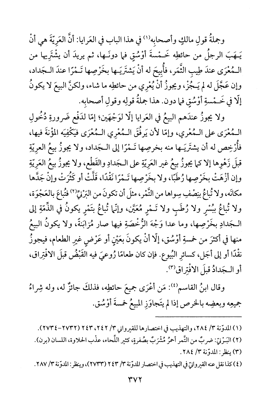 ولا يجوزُ عندَهم البيعُ في العَرايا إلّا لوَجْهَين؛ إمّا لدَفْع ضَرورةِ دُخُولِ المُعْرَى على المُعْري، وإمّا لأن يَرفُقَ المُعْرِي المُعْرَى فيَكْفِيَه المؤْنةَ فيها، فأُرْخِص له أن يشتَرَيها منه بخرصِها تَمْرًا إلى الجَداد، ولا يجوزُ بيعُ العرِيّةِ قبلَ زَهْوِها إلا كما يجوزُ بيعُ غير العَرِلة على الجَدادِ والقَطْع، ولا يجوزُ بيعُ العَرِيّةِ وإن أزْهَتْ بخَرْصِها رُطَبًا، ولا بخَرْصِها تَمْرًا نَقْدًا، قَلَّتْ أو كَثُرَتْ وإنْ جَدَّها مكانَه، ولا تُباعُ بنِصفِ سِواها من التَّمْر، مثلَ أن تكونَ من البَرْنيِّ (¬٢) فتُباعَ بالعَجْوَة، ولا تُباعُ ببُسْرٍ ولا رُطَبٍ ولا تَمْرٍ مُعَيَّن، وإنّما تُباعُ بتَمْرٍ يكونُ في الذِّمّةِ إلى الجَدادِ بخَرْصِها، وما عدا وَجْهَ الرُّخْصَةِ فيها صار مُزابَنةً، ولا يكونُ البيعُ منها في أكثرَ من خمسةِ أوْسُق، إلّا أنْ يكونَ بعَيْنٍ أو عَرْضٍ غيرِ الطعام، فيجوز نقْدًا أو إلى أجَل، كسائرِ البُيوع. فإن كان طعامًا رُوعيَ فيه القَبْضُ قبلَ الافْتِراق، أو الجَدادُ قبلَ الافْتِراق (¬٣).