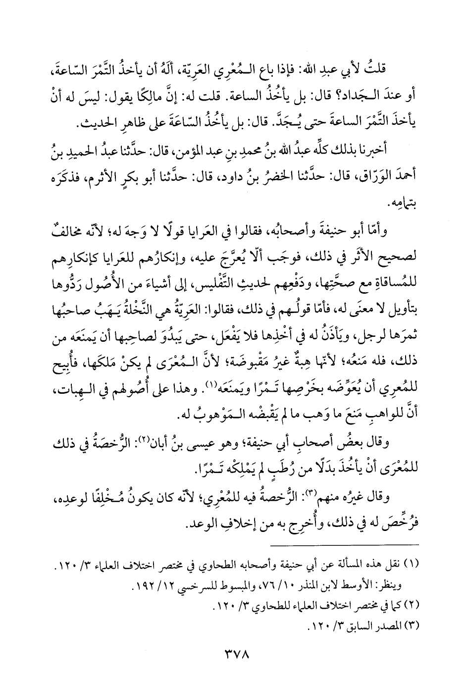 قلتُ لأبي عبدِ الله: فإذا باع المُعْرِي العَرِيّة، أنَّهُ أن يأخذُ التَّمْرَ السّاعةَ، أو عندَ الجَداد؟ قال: بل يأخُذُ الساعة. قلت له: إنَّ مالِكًا يقول: ليسَ له أنْ يأخذَ التَّمْرَ الساعةَ حتى يُجَدَّ. قال: بل يأخُذُ السّاعَةَ على ظاهرِ الحديث.