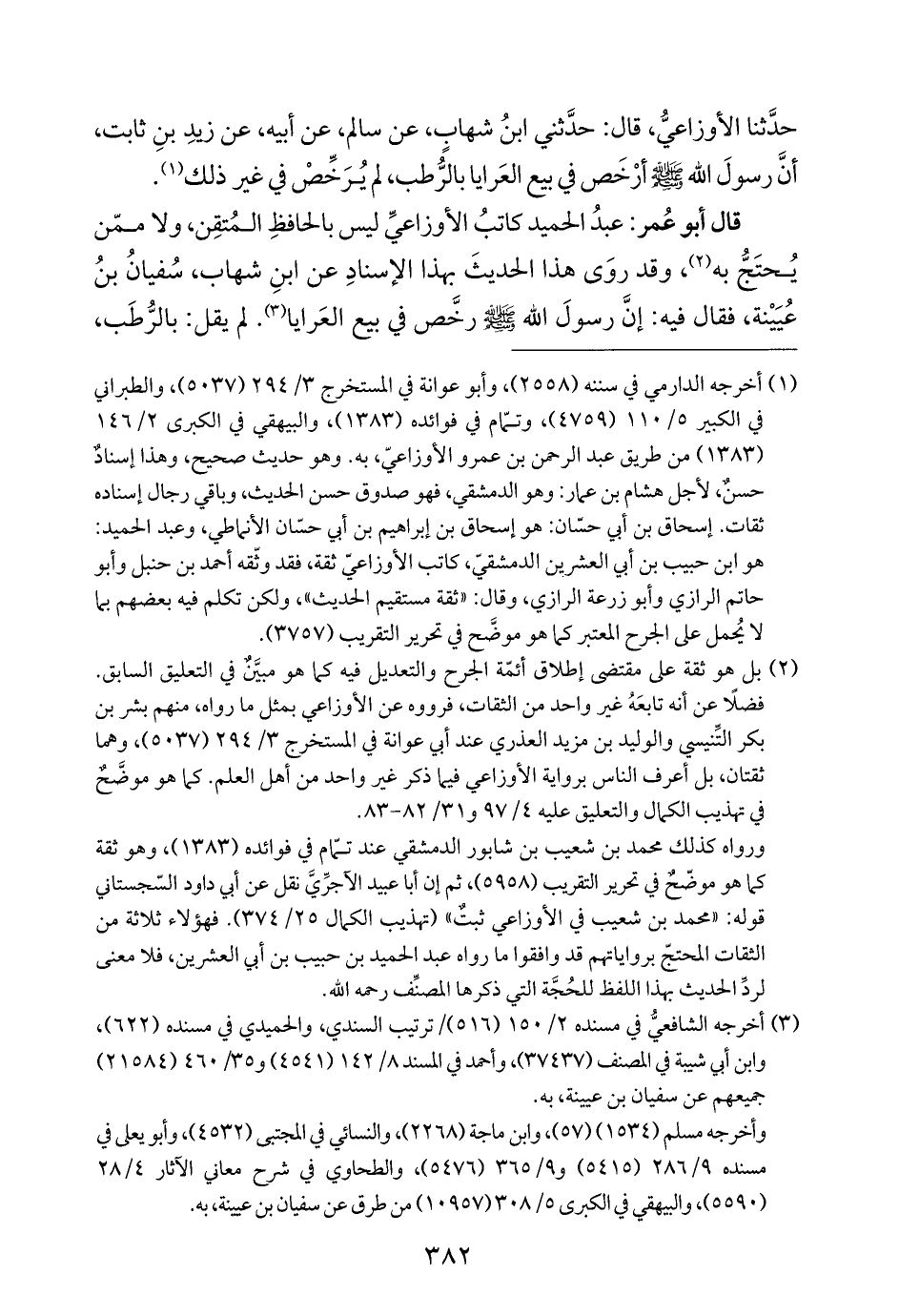 حدَّثنا الأوزاعيُّ، قال: حدَّثني ابنُ شهابٍ، عن سالم، عن أبيه، عن زيدِ بنِ ثابت، أنَّ رسولَ الله - صلى الله عليه وسلم - أرْخَص في بيع العَرايا بالَرُّطب، لم يُرَخِّصْ في غير ذلك (¬١).