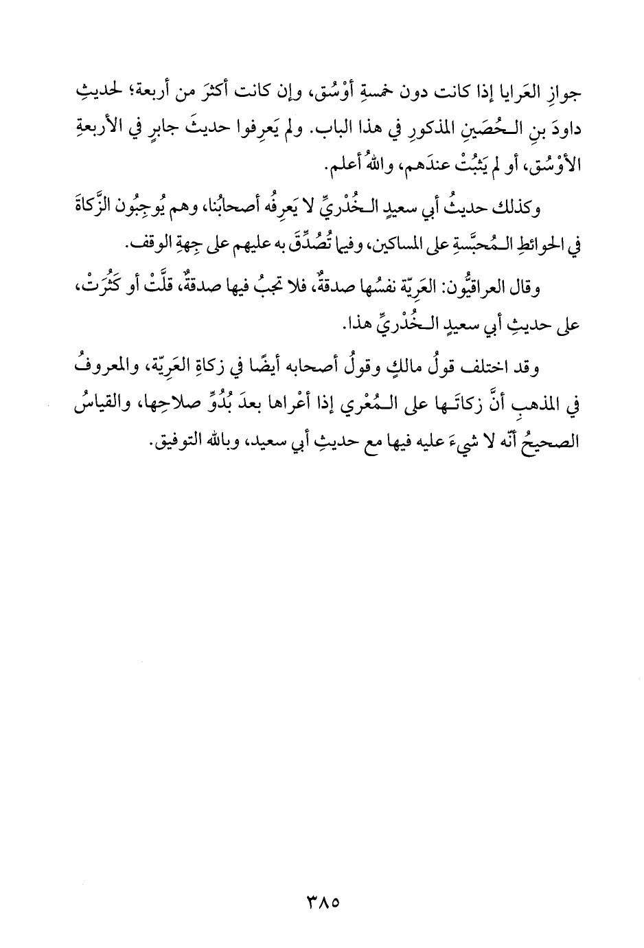 وقال العراقيُّون: العَرِيّة نفسُها صدقةٌ، فلا تجبُ فيها صدقةٌ، قلَّتْ أو كَثُرَتْ، على حديثِ أبي سعيدٍ الخُدْريِّ هذا.