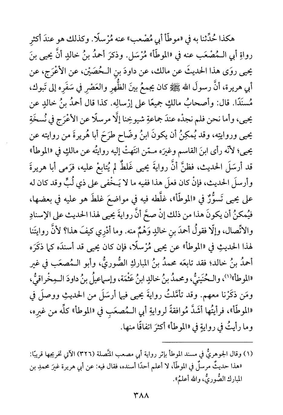 هكذا حُدِّثنا به في "موطّأ أبي مُصعب" عنه مُرْسلًا. وكذلك هو عندَ أكثرِ رواةِ أبي المُصْعَب عنه في "الموطّأ" مُرْسَل. وذكرَ أحمدُ بنُ خالدٍ أنَّ يحيى بنَ يحيى روَى هذا الحديثَ عن مالك، عن داودَ بنِ الحُصَيْن، عن الأعْرَج، عن أبي هريرة، أنَّ رسولَ الله - صلى الله عليه وسلم - كان يجمعُ بينَ الظُّهرِ والعَصْرِ في سَفَرِه إلى تَبوك، مُسنَدًا. قال: وأصحابُ مالكٍ جميعًا على إرْسالِه. كذا قال أحمدُ بنُ خالدٍ عن يحيى، وأما نحن فلم نجدْه عندَ جماعةِ شيوخِنا إلَّا مرسلًا عن الأعْرَج في نُسخَةِ يحيى وروايته، وقد يُمكِنُ أن يكونَ ابنُ وضّاح طرَحَ أبا هُريرةَ من روايته عن يحيى؛ لأنّه رأى ابنَ القاسم وغيرَه ممّن انتَهتْ إليه روايتُه عن مالكٍ في "الموطأ" قد أرسَلَ الحديث، فظنَّ أنَّ روايةَ يحيى غَلطٌ لم يُتابعْ عليه، فرَمى أبا هريرةَ وأرسلَ الحديث، فإنْ كان فعلَ هذا ففيه ما لا يَخْفى على ذي لُبٍّ وقد كان له على يحيى تَسوُّرٌ في "الموطّأ"، غلَّطه فيه في مواضعَ غلطَ هو عليه في بعضها، فيُمكنُ أن يكونَ هذا من ذلك إنْ صحَّ أنَّ روايةَ يحيى لهذا الحديث على الإسنادِ والاتِّصال، وإلّا فقولُ أحمدَ بنِ خالدٍ وَهْمٌ منه. وما أدْرِي كيفَ هذا؟ لأنَّ روايتَنا لهذا الحديثِ في "الموطأ" عن يحيى مُرْسلًا، فإن كان يحيى قد أسندَه كما ذكَرَه أحمدُ بنُ خالد؛ فقد تابعَه محمدُ بنُ المباركِ الصوريُّ، وأبو المُصعَب في غير "الموطأ" (¬١)، والحُنَينيُّ، ومحمدُ بنُ خالدٍ ابنُ عَثْمَة، وإسماعيلُ بنُ داودَ المِخْراقيُّ، ومَن ذكَرْنا معهم. وقد تأمَّلتُ روايةَ يحيى فيما أرسَلَ من الحديثِ ووصلَ في "الموطّأ"، فرأيتُها أشَدَّ مُوافقةً لروايةِ أبي المُصعَبِ في "الموطأ" كلِّه من غيرِه، وما رأيتُ في روايةٍ في "الموطأ" أكثرَ اتفاقًا منها.