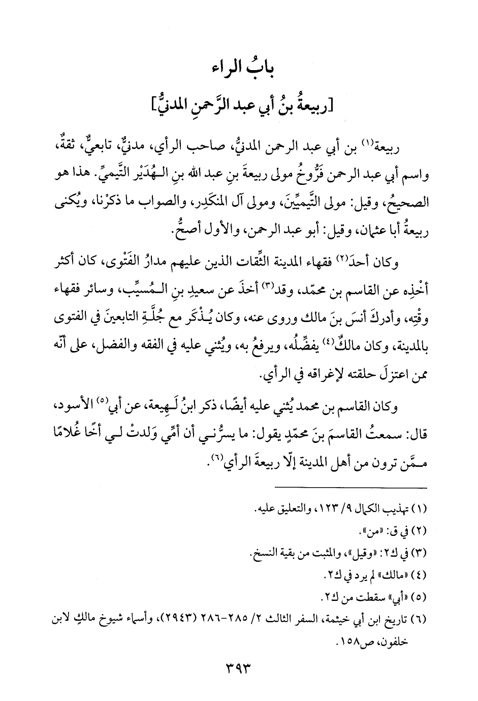 ربيعة (¬١) بن أبي عبد الرحمن المدنيُّ، صاحب الرأي، مدنيٌّ، تابعيٌّ، ثقةٌ، واسم أبي عبد الرحمن فَرُّوخُ مولى ربيعةَ بنِ عبد الله بنِ الهُدَيْر التَّيميِّ. هذا هو الصحيحُ، وقيل: مولى التَّيميِّينَ، ومولى آل المنكَدِر، والصواب ما ذكرْنا، ويُكنى ربيعةُ أبا عثمان، وقيل: أبو عبد الرحمن، والأول أصحُّ.