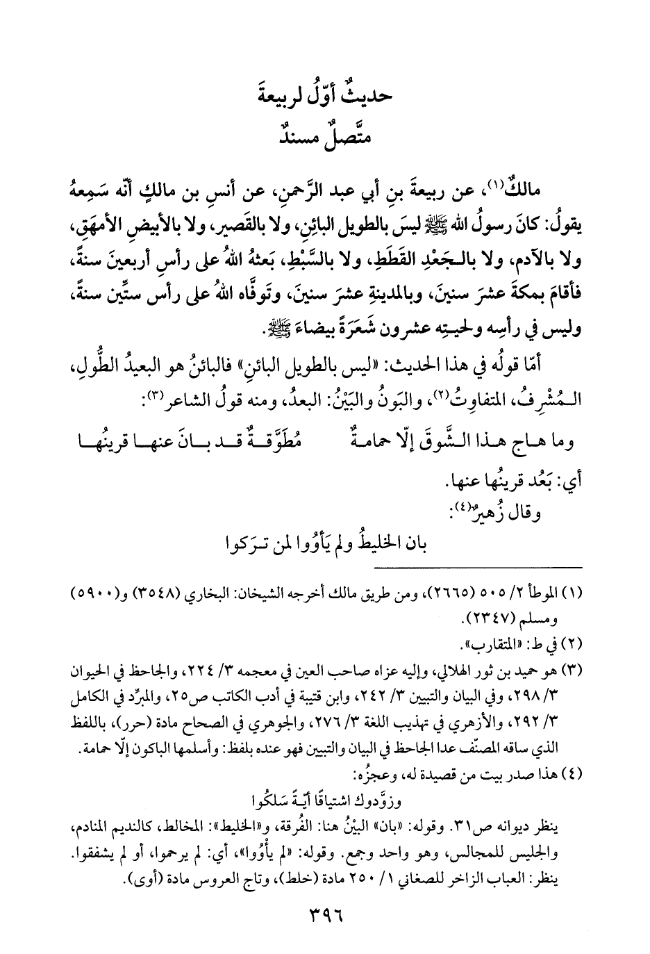 مالكٌ (¬١)، عن ربيعةَ بنِ أبى عبد الرَّحمنِ، عن أنسِ بن مالكٍ أنّه سَمِعهُ يقولُ: كانَ رسولُ الله - صلى الله عليه وسلم - ليسَ بالطويل البائِنِ، ولا بالقَصير، ولا بالأبيضِ الأمهَقِ، ولا بالآدم، ولا بالجَعْدِ القَطَطِ، ولا بالسَّبْطِ، بَعثهُ اللهُ على رأسِ أربعينَ سنةً، فأقامَ بمكةَ عشرَ سنينَ، وبالمدينةِ عشرَ سنينَ، وتَوفَّاه اللهُ على رأس ستِّين سنةً، وليس في رأسِه ولحيتِه عشرون شَعَرَةً بيضاءَ - صلى الله عليه وسلم -.