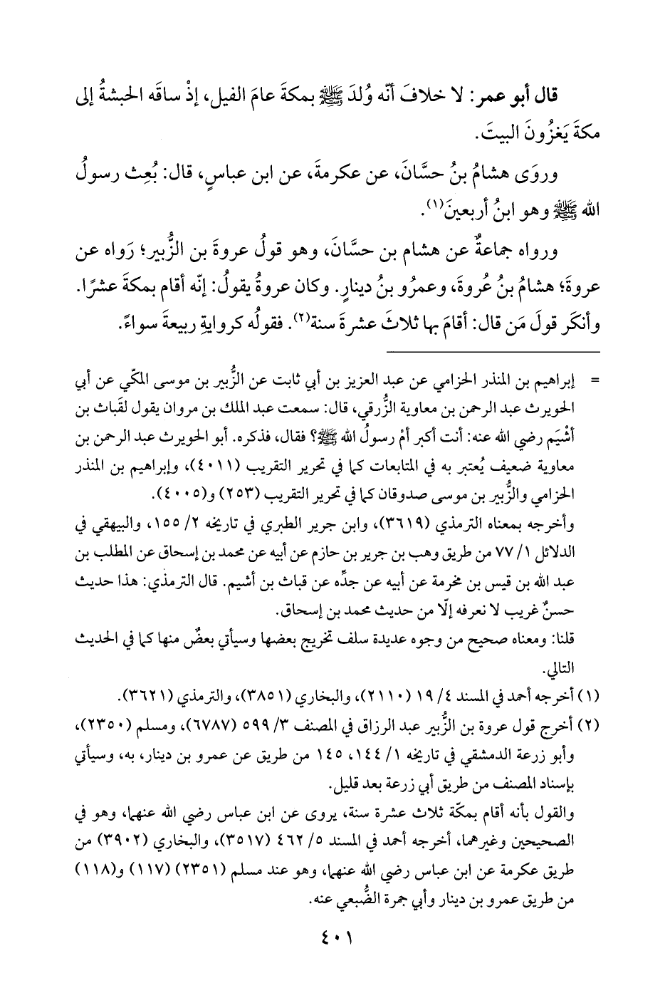 قال أبو عمر: لا خلافَ أنّه وُلدَ - صلى الله عليه وسلم - بمكةَ عامَ الفيل، إذْ ساقَه الحبشةُ إلى مكةَ يَغزُونَ البيتَ.