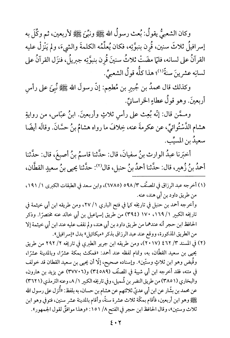 وممَّن قال: إنّه بُعِث على رأسِ ثلاثٍ وأربعينَ. ابنُ عبّاس، من روايةِ هشام الدَّسْتُوائيِّ، عن عكرمةَ عنه، خِلافَ ما رواه هشامُ بنُ حسَّانَ. وقالَه أيضًا سعيدُ بن المسيِّب.