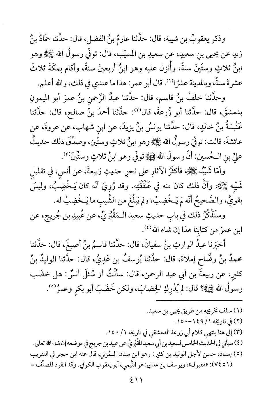 أخبَرنا عبدُ الوارثِ بنُ سفيانَ، قال: حدَّثنا قاسمُ بنُ أصبغَ، قال: حدَّثنا محمدُ بنُ وضَّاح إملاءً، قال: حدَّثنا يُوسفُ بن عَدِيٍّ، قال: حدَّثنا الوليدُ بنُ كثيرٍ، عن ربيعةَ بن أبي عبد الرحمن، قال: سألْتُ أو سُئلَ أنسٌ: هل خضَب رسولُ الله - صلى الله عليه وسلم -؟ قال: لم يُدْرِكِ الخِضابَ، ولكن خَضبَ أبو بكرٍ وعمرُ (¬٥).