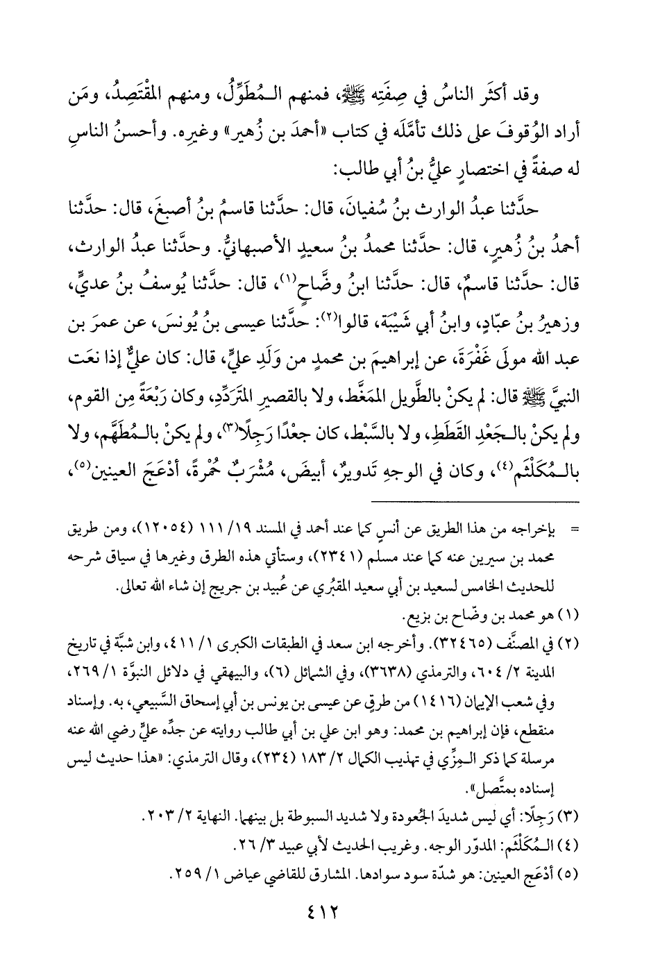 حدَّثنا عبدُ الوارث بنُ سُفيانَ، قال: حدَّثنا قاسمُ بنُ أصبغَ، قال: حدَّثنا أحمدُ بنُ زُهيرٍ، قال: حدَّثنا محمدُ بنُ سعيدٍ الأصبهانيُّ. وحدَّثنا عبدُ الوارث، قال: حدَّثنا قاسمٌ، قال: حدَّثنا ابنُ وضَّاحٍ (¬١)، قال: حدَّثنا يُوسفُ بنُ عديٍّ، وزهيرُ بنُ عبّادٍ، وابنُ أبي شَيْبَة، قالوا (¬٢): حدَّثنا عيسى بنُ يُونسَ، عن عمرَ بن عبد الله مولَى غَفْرَةَ، عن إبراهيمَ بن محمدٍ من وَلَدِ عليٍّ، قال: كان عليٌّ إذا نعَت النبيَّ - صلى الله عليه وسلم - قال: لم يكنْ بالطَّويل الممَغَّط، ولا بالقصيرِ المتَرَدِّدِ، وكان رَبْعَةً مِن القوم، ولم يكنْ بالجَعْدِ القَطَطِ، ولا بالسَّبْط، كان جعْدًا رَجِلًا (¬٣)، ولم يكنْ بالمُطَهَّم، ولا بالمُكَلْثَم (¬٤)، وكان في الوجهِ تَدويرٌ، أبيضَ، مُشْرَبٌ حُمرةً، أدْعَجَ العينين (¬٥)،