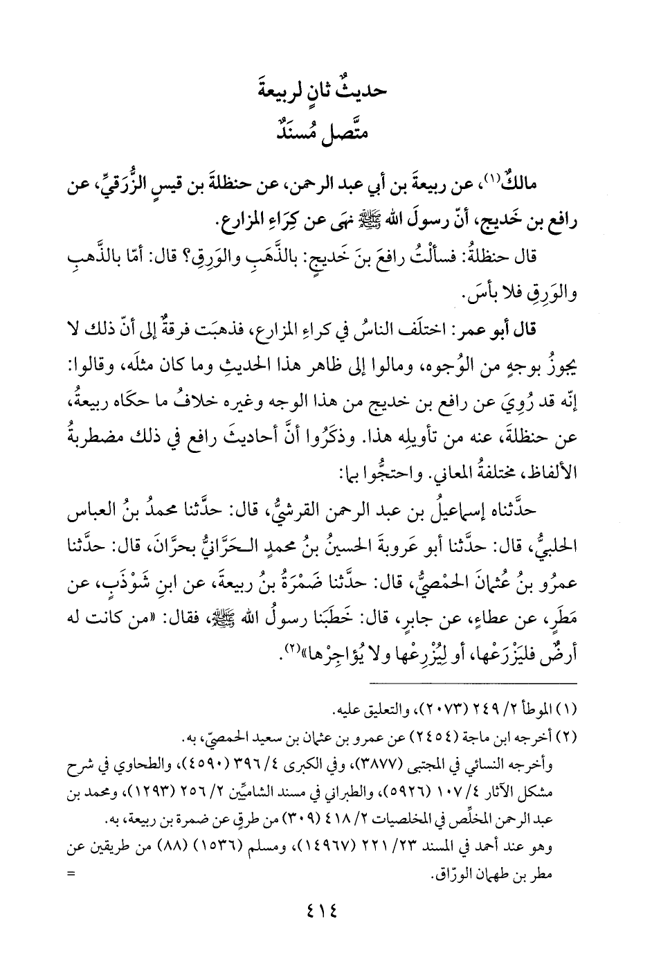 مالكٌ (¬١)، عن ربيعةَ بن أبي عبد الرحمن، عن حنظلةَ بن قيسٍ الزّرَقيِّ، عن رافع بن خَديج، أنّ رسولَ الله - صلى الله عليه وسلم - نهَى عن كِرَاءِ المزارع.