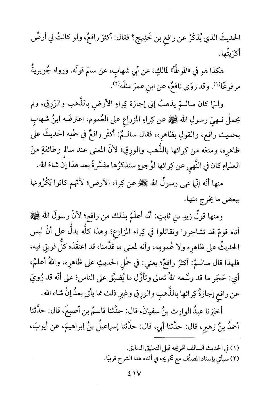 ولمّا كان سالمٌ يذهبُ إلى إجازة كِراءِ الأرضِ بالذَّهب والوَرِقِ، ولم يحملْ نهيَ رسولِ الله - صلى الله عليه وسلم - عن كِراءِ المزراعِ على العُموم، اعترضَه ابنُ شهابٍ بحديث رافع، والقولِ بظاهرِه، فقال سالمٌ: أكثَر رافعٌ في حمْلِه الحديثَ على ظاهرِه، ومنعَه من كِرائها بالذَّهب والورِقِ؛ لأنّ المعنى عند سالمٍ وطائفةٍ منَ العلماءِ كان في النَّهيِ عن كِرائها لوُجوهٍ سنذكرُها مفسَّرةً بعد هذا إن شاءَ الله.