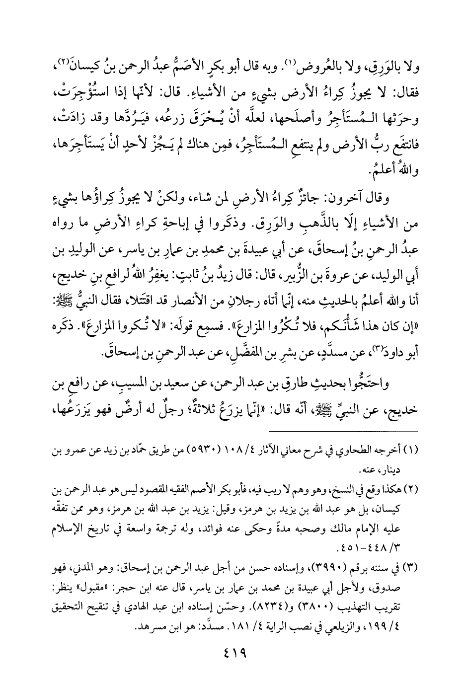 واحتَجُّوا بحديثِ طارقِ بن عبد الرحمن، عن سعيد بن المسيبِ، عن رافعِ بن خديج، عن النبيِّ - صلى الله عليه وسلم -، أنّه قال: "إنّما يزرَعُ ثلاثةٌ؛ رجلٌ له أرضٌ فهو يَزرَعُها،