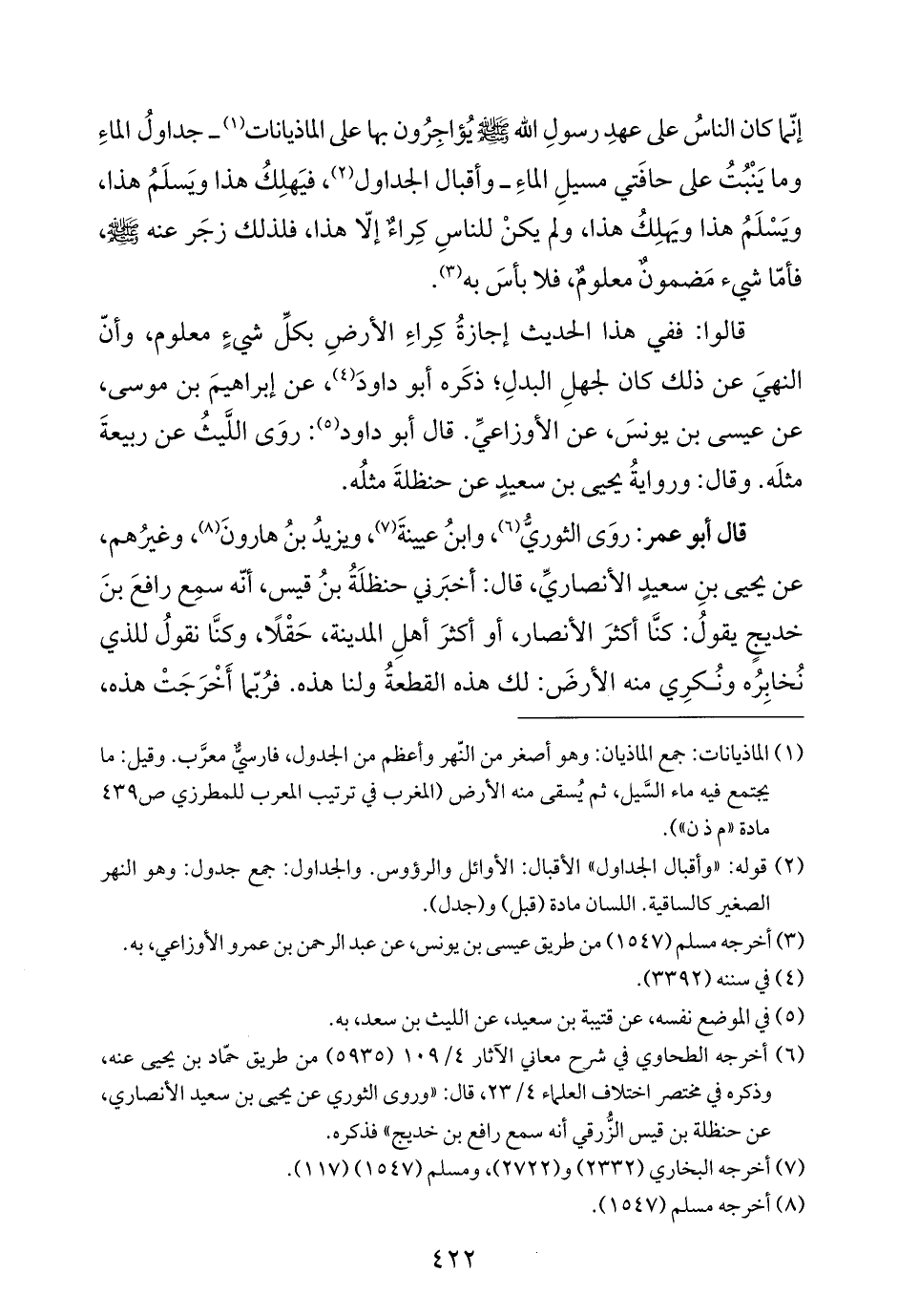إنّما كان الناسُ على عهدِ رسولِ الله - صلى الله عليه وسلم - يُؤاجِرُون بها على الماذيانات (¬١) - جداولُ الماءِ وما يَنْبُتُ على حافَتي مسيلِ الماءِ - وأقبال الجداول (¬٢)، فيَهلِكُ هذا ويَسلَمُ هذا، ويَسْلَمُ هذا ويَهلِكُ هذا، ولم يكنْ للناسِ كِراءٌ إلّا هذا، فلذلك زجَر عنه - صلى الله عليه وسلم -، فأمّا شيء مَضمونٌ معلومٌ، فلا بأسَ به (¬٣).