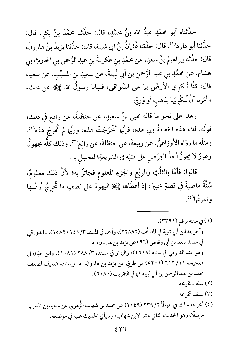 حدَّثناه أبو محمَّدٍ عبدُ الله بنُ محمَّدٍ، قال: حدَّثنا محمَّدُ بنُ بكرٍ، قال: حدَّثنا أبو داود (¬١)، قال: حدَّثنا عُثمانُ بنُ أبي شيبة، قال: حدَّثنا يزيدُ بنُ هارونَ، قال: حدَّثنا إبراهيمُ بنُ سعدٍ، عن محمَّدِ بنِ عكرمةَ بنِ عبدِ الرَّحمن بنِ الحارثِ بنِ هشام، عن محمَّدِ بنِ عبدِ الرَّحمنِ بن أبي لَبِيبةَ، عن سعيدِ بنِ المسيِّبِ، عن سعدٍ، قال: كنَّا نُكْرِي الأرضَ بما على السَّواقي، فنهانا رسولُ الله - صلى الله عليه وسلم - عن ذلك، وأمَرنا أنْ نُكْرِيَها بذهبٍ أو وَرِقٍ.