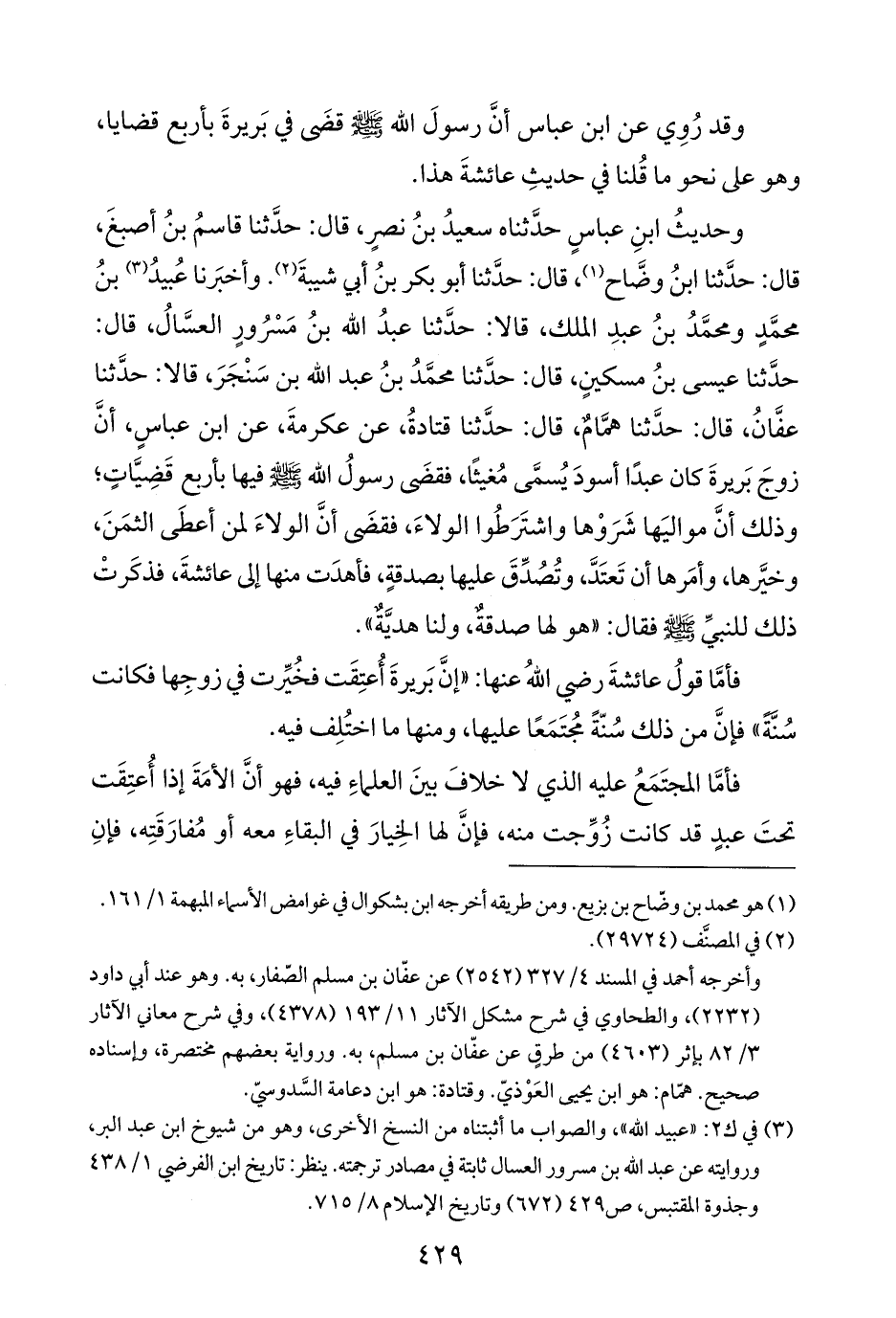 وحديثُ ابنِ عباسٍ حدَّثناه سعيدُ بنُ نصرٍ، قال: حدَّثنا قاسمُ بنُ أصبغَ، قال: حدَّثنا ابنُ وضَّاح (¬١)، قال: حدَّثنا أبو بكر بنُ أبي شيبةَ (¬٢). وأخبَرنا عُبيدُ (¬٣) بنُ محمَّدٍ ومحمَّدُ بنُ عبدِ الملك، قالا: حدَّثنا عبدُ الله بنُ مَسْرُورٍ العسَّالُ، قال: حدَّثنا عيسى بنُ مسكينٍ، قال: حدَّثنا محمَّدُ بنُ عبد الله بن سَنْجَرَ، قالا: حدَّثنا عفَّانُ، قال: حدَّثنا همَّامٌ، قال: حدَّثنا قتادةُ، عن عكرمةَ، عن ابن عباسٍ، أنَّ زوجَ بَريرةَ كان عبدًا أسودَ يُسمَّى مُغيثًا، فقضى رسولُ الله - صلى الله عليه وسلم - فيها بأربع قَضِيَّاتٍ؛ وذلك أنَّ مواليَها شَرَوْها واشتَرَطُوا الولاءَ، فقضى أنَّ الولاءَ لمن أعطَى الثمَنَ، وخيَّرها، وأمَرها أن تَعتَدَّ، وتُصُدِّقَ عليها بصدقةٍ، فأهدَت منها إلى عائشةَ، فذكَرتْ ذلك للنبيِّ - صلى الله عليه وسلم - فقال: "هو لها صدقةٌ، ولنا هديَّةٌ".