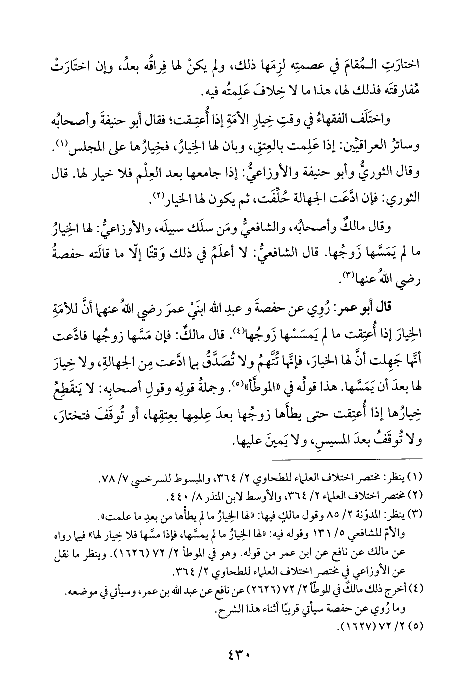 (¬٣) ينظر: المدوّنة ٢/ ٨٥ وقول مالكٍ فيها: "لها الخِيارُ ما لم يطأْها من بعدِ ما علمت".