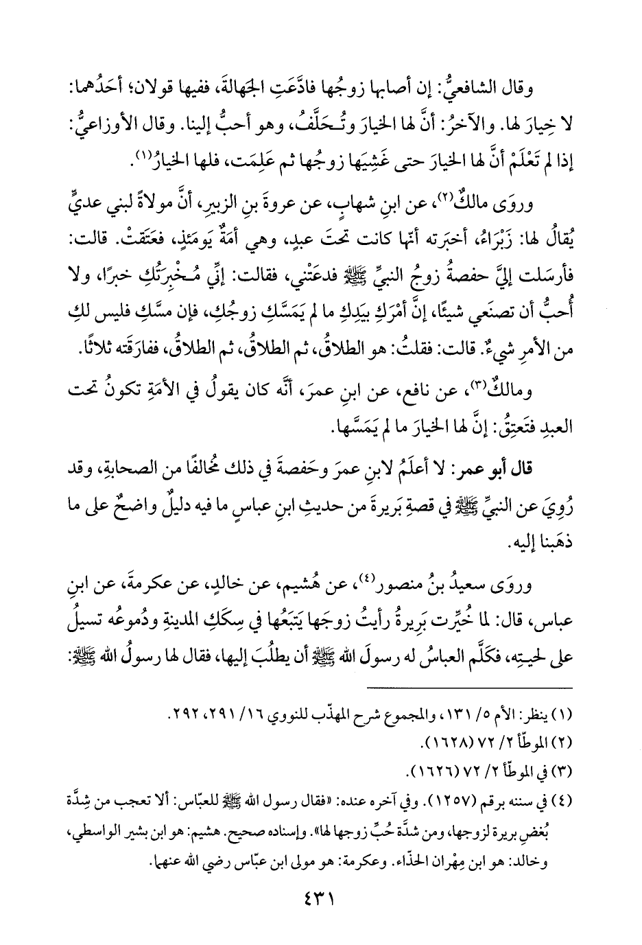 وروَى سعيدُ بنُ منصور (¬٤)، عن هُشيم، عن خالدٍ، عن عكرمةَ، عن ابنِ عباس، قال: لما خُيِّرت بَرِيرةُ رأيتُ زوجَها يَتبَعُها في سِكَكِ المدينةِ ودُموعُه تسيلُ على لحيتِه، فكَلَّم العباسُ له رسولَ الله - صلى الله عليه وسلم - أن يطلُبَ إليها، فقال لها رسولُ الله - صلى الله عليه وسلم -: