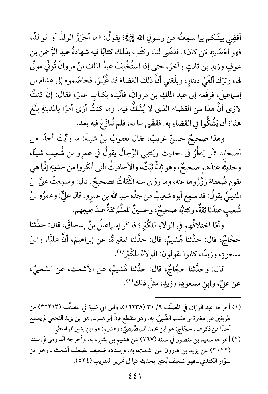 وهذا صحيحٌ حسنٌ غريبٌ، فقال يعقوبُ بنُ شيبةَ: ما رأيْتُ أحدًا من أصحابِنا ممَّن يَنظُرُ في الحديث وَينتقِي الرِّجالَ يقولُ في عمرِو بن شُعيبٍ شيئًا، وحديثُه عندَهم صحيحٌ، وهو ثِقةٌ ثبَتٌ، والأحاديثُ التي أنكَروا من حديثه إنَّما هي لقومٍ ضُعفاءَ زوَّرُوها عنه، وما روَى عنه الثِّقاتُ فصحيحٌ. قال: وسمِعتُ عليَّ بنَ المدينيِّ يقولُ: قد سمِع أبوه شعيبٌ من جدِّه عبدِ الله بن عمرٍو. قال عليٌّ: وعمرُو بنُ شُعيبٍ عندَنا ثقةٌ، وكتابُه صحيحٌ، وحسينٌ المعلِّمُ ثقةٌ عندَ جميعِهم.