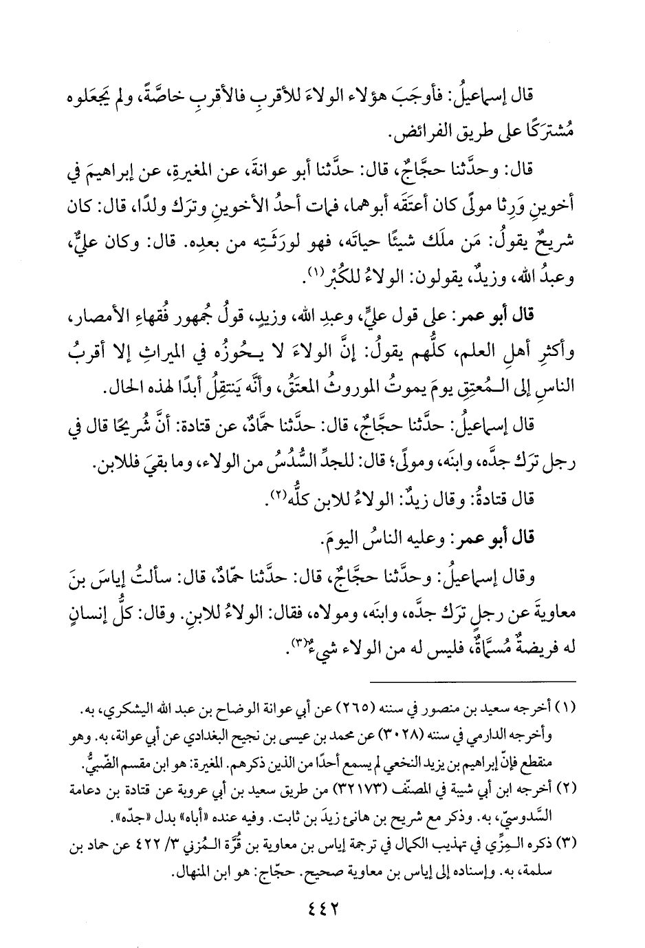 وقال إسماعيلُ: وحدَّثنا حجَّاج، قال: حدَّثنا حمّادٌ، قال: سألتُ إياسَ بنَ معاويةَ عن رجلٍ ترَك جدَّه، وابنَه، ومولاه، فقال: الولاءُ للابنِ. وقال: كلُّ إنسانٍ له فريضةٌ مُسمَّاةٌ، فليس له من الولاء شيءٌ (¬٣).