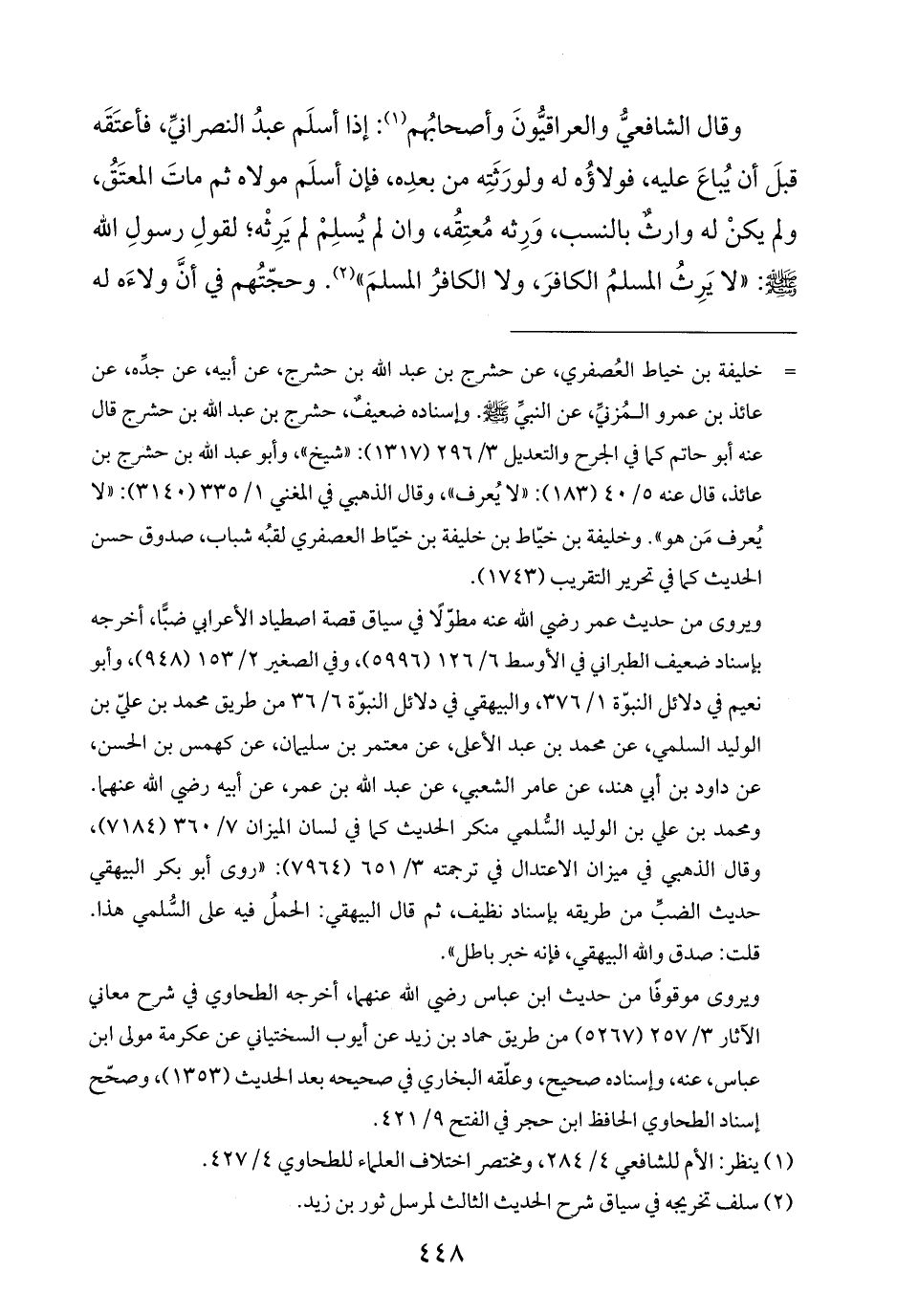 وقال الشافعيُّ والعراقيُّونَ وأصحابُهم (¬١): إذا أسلَم عبدُ النصرانيِّ، فأعتَقَه قبلَ أن يُباعَ عليه، فولاؤُه له ولورَثَتِه من بعدِه، فإن أسلَم مولاه ثم ماتَ المعتَقُ، ولم يكنْ له وارثٌ بالنسب، وَرِثه مُعتِقُه، وان لم يُسلِمْ لم يَرِثْه؛ لقولِ رسولِ الله - صلى الله عليه وسلم -: "لا يَرِثُ المسلمُ الكافرَ، ولا الكافرُ المسلمَ" (¬٢). وحجّتُهم في أنَّ ولاءَه له