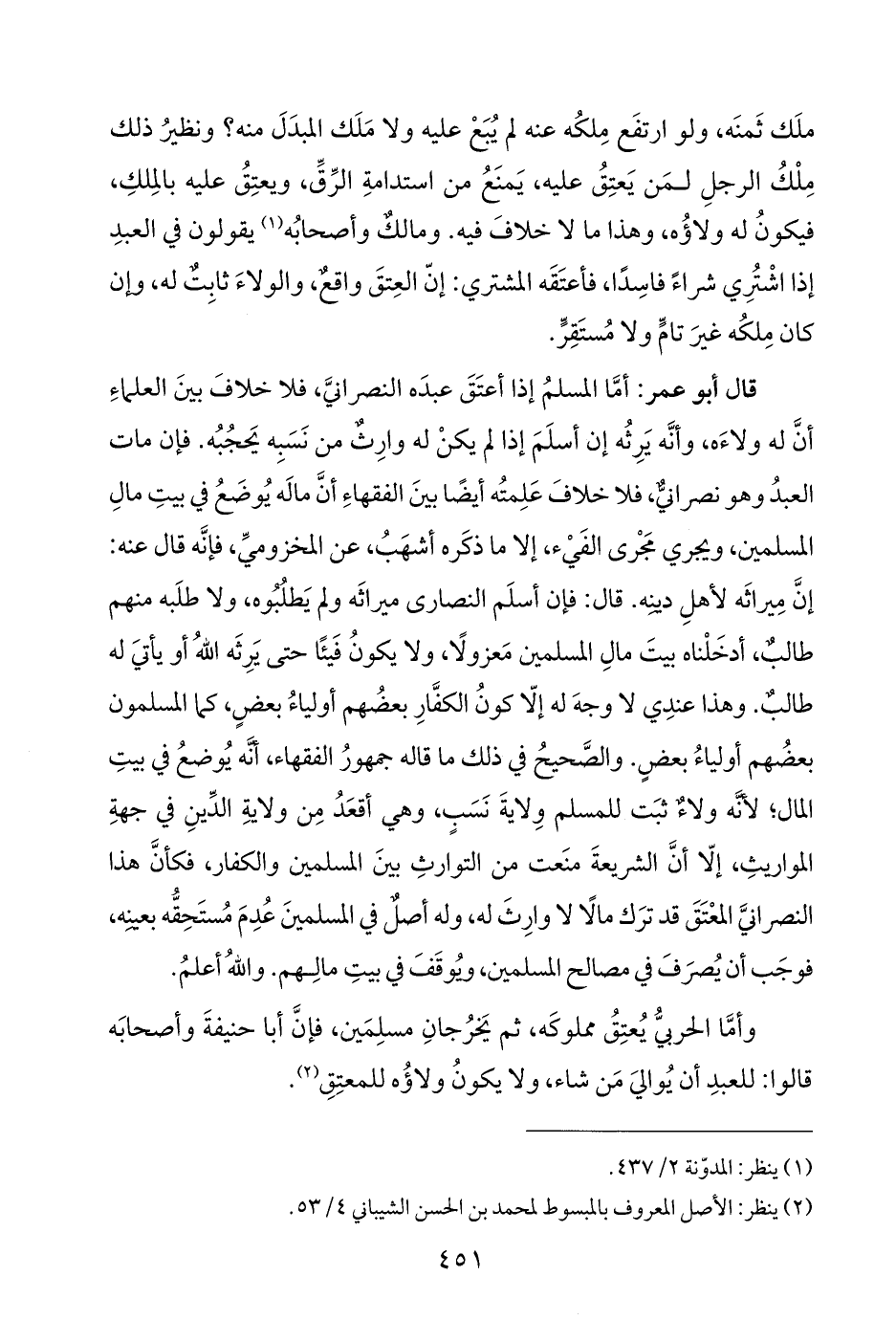 قال أبو عمر: أمَّا المسلمُ إذا أعتَقَ عبدَه النصرانيَّ، فلا خلافَ بينَ العلماءِ أنَّ له ولاءَه، وأنَّه يَرِثُه إن أسلَمَ إذا لم يكنْ له وارِثٌ من نَسَبِه يَحجُبُه. فإن مات العبدُ وهو نصرانيٌّ، فلا خلافَ عَلِمتُه أيضًا بينَ الفقهاءِ أنَّ مالَه يُوضَعُ في بيتِ مالِ المسلمين، ويجري مَجْرى الفَيْء، إلا ما ذكَره أشهَبُ، عن المخزوميِّ، فإنَّه قال عنه: إنَّ مِيراثَه لأهلِ دينِه. قال: فإن أسلَم النصارى ميراثَه ولم يَطلُبُوه، ولا طلَبه منهم طالبٌ، أدخَلْناه بيتَ مالِ المسلمين مَعزولًا، ولا يكونُ فَيئًا حتى يَرِثَه اللهُ أو يأتيَ له طالبٌ. وهذا عندِي لا وجهَ له إلّا كونُ الكفَّارِ بعضُهم أولياءُ بعضٍ، كما المسلمون بعضهم أولياءُ بعضٍ. والصَّحيحُ في ذلك ما قاله جمهورُ الفقهاء، أنَّه يُوضعُ في بيتِ المال؛ لأنَّه ولاءٌ ثبَت للمسلم وِلايةَ نَسَبٍ، وهي أقعَدُ مِن ولايةِ الدِّينِ في جهةِ المواريثِ، إلّا أنَّ الشريعةَ منَعت من التوارثِ بينَ المسلمين والكفار، فكأنَّ هذا النصرانيَّ المعْتَقَ قد ترَك مالًا لا وارِثَ له، وله أصل في المسلمينَ عُدِمَ مُستَحِقُّه بعينِه، فوجَب أن يُصرَفَ في مصالح المسلمين، ويوقَفَ في بيتِ مالِهم. واللّهُ أعلمُ.