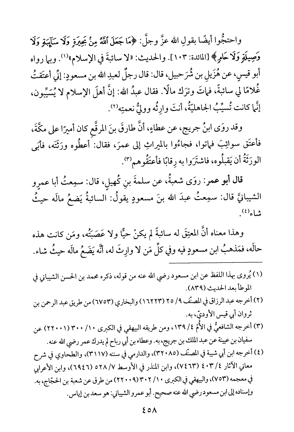 واحتجُّوا أيضًا بقولِ الله عزَّ وجلَّ: {مَا جَعَلَ اللَّهُ مِنْ بَحِيرَةٍ وَلَا سَائِبَةٍ وَلَا وَصِيلَةٍ وَلَا حَامٍ} [المائدة: ١٠٣]. والحديث: "لا سائبةَ في الإسلام" (¬١). وبما رواه أبو قيسٍ، عن هُزَيلِ بن شُرَحبيل، قال: قال رجلٌ لعبدِ الله بن مسعودٍ: إنِّي أعتَقتُ غُلامًا لي سائبةً، فماتَ وترَك مالًا. فقال عبدُ الله: إنَّ أهلَ الإسلام لا يُسَيِّبون، إنَّما كانت تُسيِّبُ الجاهليّةُ، أنتَ وارِثُه ووليُّ نعمتِه (¬٢).