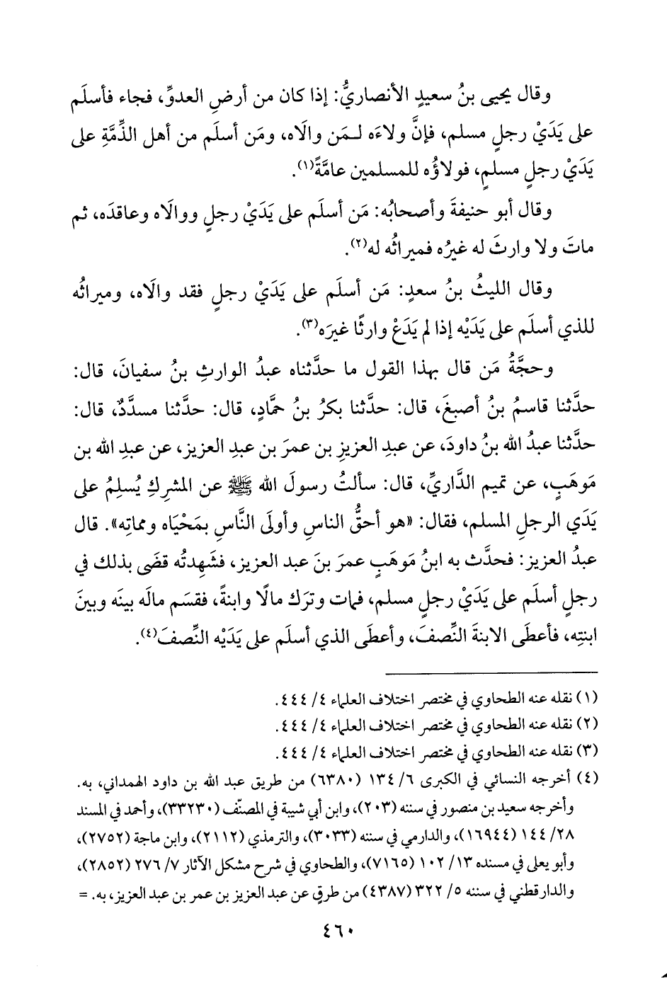 وحجَّةُ مَن قال بهذا القول ما حدَّثناه عبدُ الوارثِ بنُ سفيانَ، قال: حدَّثنا قاسمُ بنُ أصبغَ، قال: حدَّثنا بكرُ بنُ حمَّادٍ، قال: حدَّثنا مسدَّدٌ، قال: حدَّثنا عبدُ الله بنُ داودَ، عن عبدِ العزيزِ بن عمرَ بن عبدِ العزيز، عن عبدِ الله بن مَوهَبٍ، عن تميم الدَّاريِّ، قال: سألتُ رسولَ الله - صلى الله عليه وسلم - عن المشرِكِ يُسلِمُ على يَدَي الرجلِ المسلم، فقال: "هو أحقُّ الناسِ وأولَى النَّاسِ بمَحْيَاه ومماتِه". قال عبدُ العزيز: فحدَّث به ابنُ مَوهَب عمرَ بنَ عبد العزيز، فشَهِدتُه قضَى بذلك في رجلٍ أسلَم على يَدَيْ رجلٍ مسلم، فمات وترَك مالًا وابنةً، فقسَم مالَه بينَه وبينَ ابنتِه، فأعطَى الابنةَ النِّصفَ، وأعطَى الذي أسلَم على يَدَيْه النِّصفَ (¬٤).