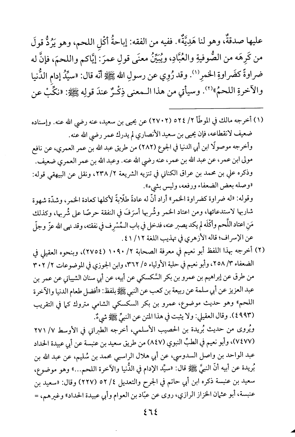 (¬٢) أخرجه بهذا اللفظ أبو نعيم في معرفة الصحابة ٢/ ١٠٩٠ (٢٧٥٤)، وبنحوه العقيلي في الضعفاء ٣/ ٢٥٨، وأبو نعيم في حلية الأولياء ٥/ ٣٦٢، وابن الجوزي في الموضوعات ٢/ ٣٠٢ من طرق عن إبراهيم بن عمرو بن بكر السَّكسكي عن أبيه، عن أبي سنان الشيباني عن عمر بن عبد العزيز عن أبي سلمة عن ربيعة بن كعب عن النبي - صلى الله عليه وسلم - بلفظ: "أفضل طعام الدنيا والآخرة اللحم" وهو حديث موضوع، عمرو بن بكر السكسكي الشامي متروك كما في التقريب (٤٩٩٣). وقال العقيلي: ولا يثبت في هذا المتن عن النبيِّ - صلى الله عليه وسلم - شيءٌ.