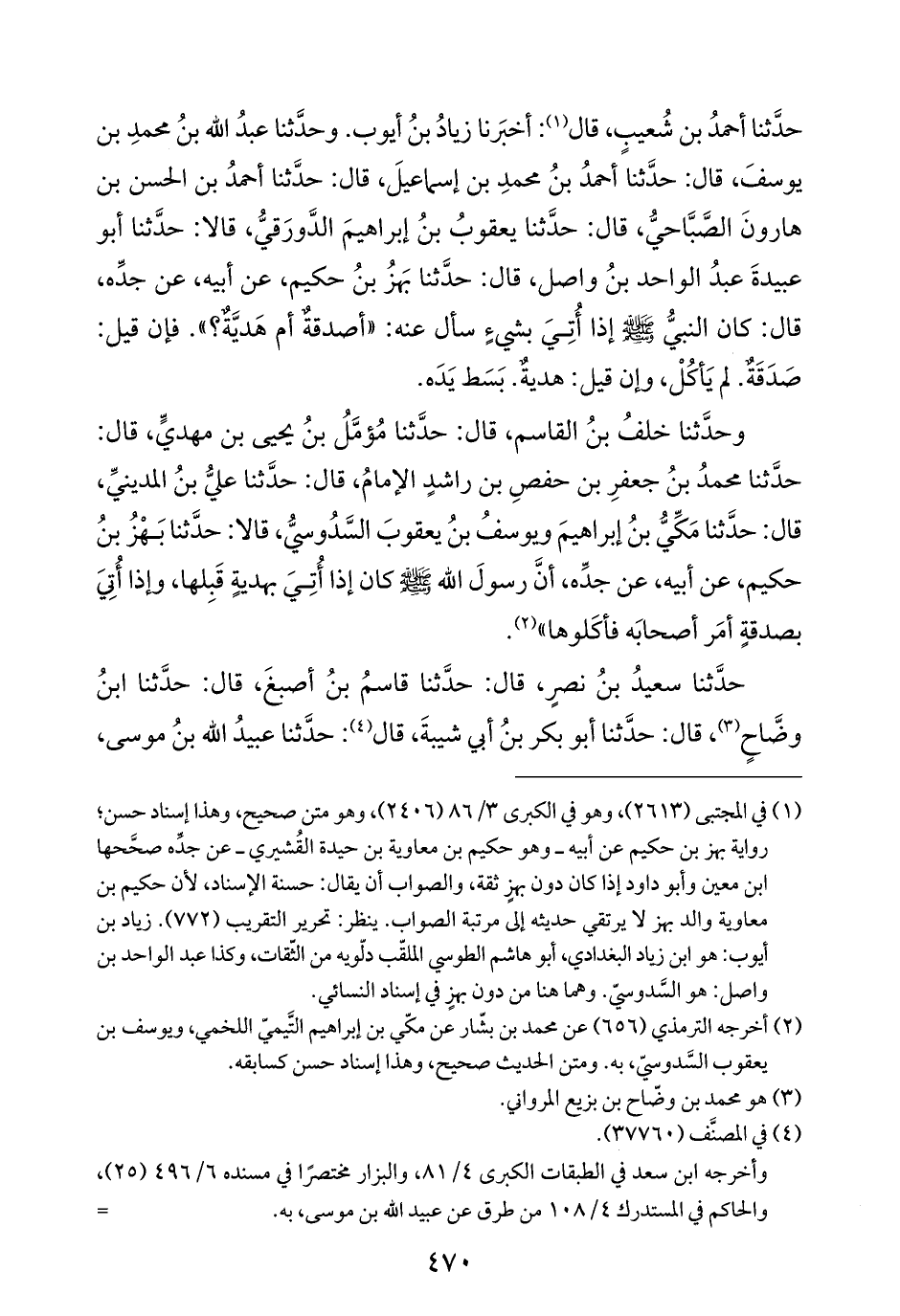 حدَّثنا أحمدُ بن شُعيبٍ، قال (¬١): أخبَرنا زيادُ بنُ أيوب. وحدَّثنا عبدُ الله بنُ محمدِ بن يوسفَ، قال: حدَّثنا أحمدُ بنُ محمدِ بن إسماعيلَ، قال: حدَّثنا أحمدُ بن الحسن بن هارونَ الصَّبَّاحيُّ، قال: حدَّثنا يعقوبُ بنُ إبراهيمَ الدَّورَقيُّ، قالا: حدَّثنا أبو عبيدةَ عبدُ الواحد بنُ واصل، قال: حدَّثنا بَهزُ بنُ حكيم، عن أبيه، عن جدِّه، قال: كان النبيُّ - صلى الله عليه وسلم - إذا أُتِيَ بشيءٍ سأل عنه: "أصدقةٌ أم هَديَّةٌ؟ ". فإن قيل: صَدَقَةٌ. لم يَأكُلْ، وإن قيل: هديةٌ. بَسَط يَدَه.