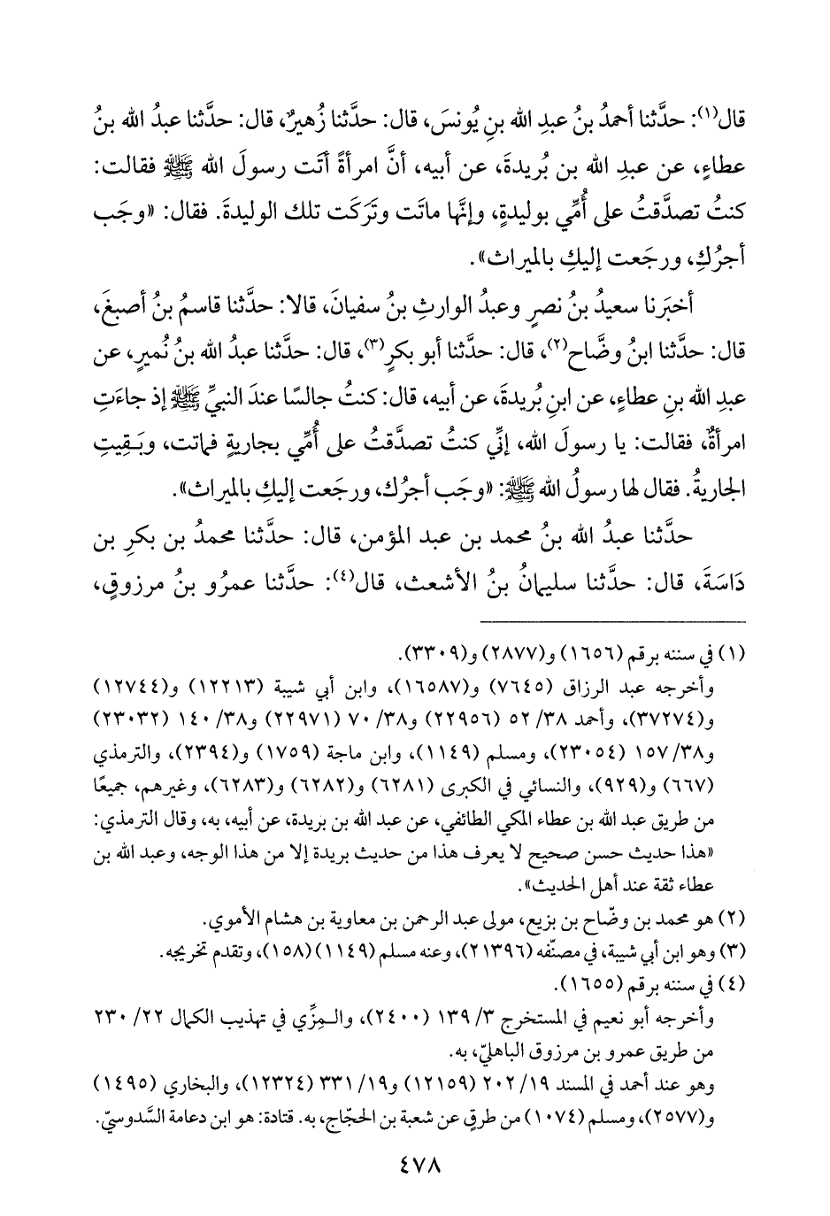 أخبَرنا سعيدُ بنُ نصرٍ وعبدُ الوارثِ بنُ سفيانَ، قالا: حدَّثنا قاسمُ بنُ أصبغَ، قال: حدَّثنا ابنُ وضَّاح (¬٢)، قال: حدَّثنا أبو بكرٍ (¬٣)، قال: حدَّثنا عبدُ الله بنُ نُميرٍ، عن عبدِ الله بنِ عطاءٍ، عن ابنِ بُريدةَ، عن أبيه، قال: كنتُ جالسًا عندَ النبيِّ - صلى الله عليه وسلم - إذ جاءَتِ امرأةٌ، فقالت: يا رسولَ الله، إنِّي كنتُ تصدَّقتُ على أُمِّي بجاريةٍ فماتت، وبَقِيتِ الجاريةُ. فقال لها رسولُ الله - صلى الله عليه وسلم -: "وجَب أجرُك، ورجَعت إليكِ بالميراث".