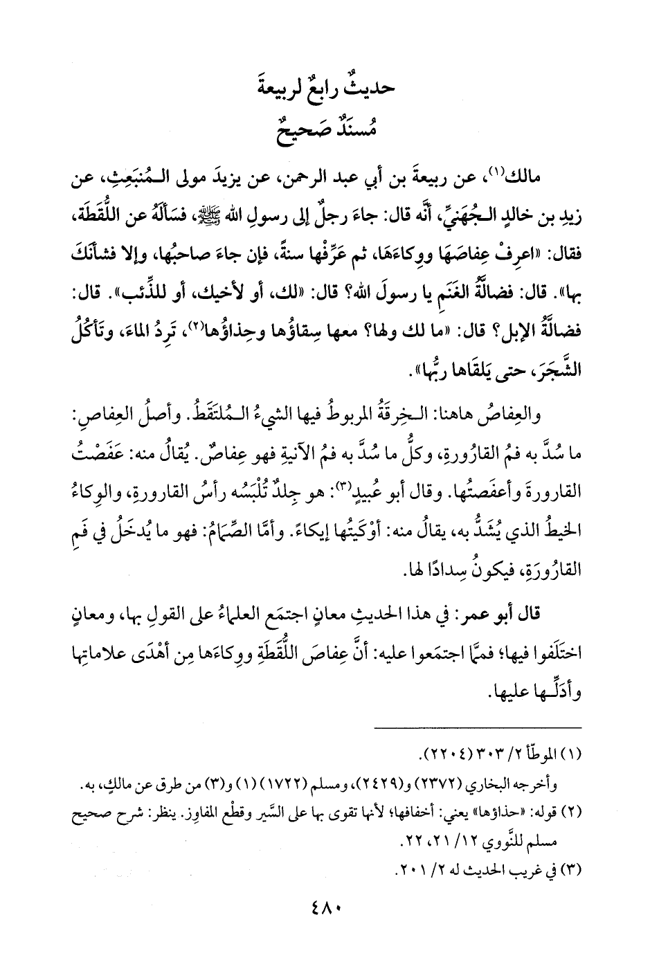 مالك (¬١)، عن ربيعةَ بن أبي عبد الرحمن، عن يزيدَ مولى المُنبَعِثِ، عن زيدِ بن خالدٍ الجُهَنيِّ، أنَّه قال: جاءَ رجلٌ إلى رسولِ الله - صلى الله عليه وسلم -، فسَألَهُ عن اللُّقَطَة، فقال: "اعرِفْ عِفاصَهَا ووِكاءَهَا، ثم عَرِّفْها سنةً، فإن جاءَ صاحبُها، وإلا فشأنَكَ بها". قال: فضالَّةُ الغنَمِ يا رسول الله؟ قال: "لك، أو لأخيك، أو للذئب". قال: فضالَّةُ الابل؟ قال: "ما لك ولها؟ معها سِقاؤُها وحِذاؤُها (¬٢)، تَرِدُ الماءَ، وتَأكلُ الشَّجَرَ، حتى يَلقَاها ربُّها".