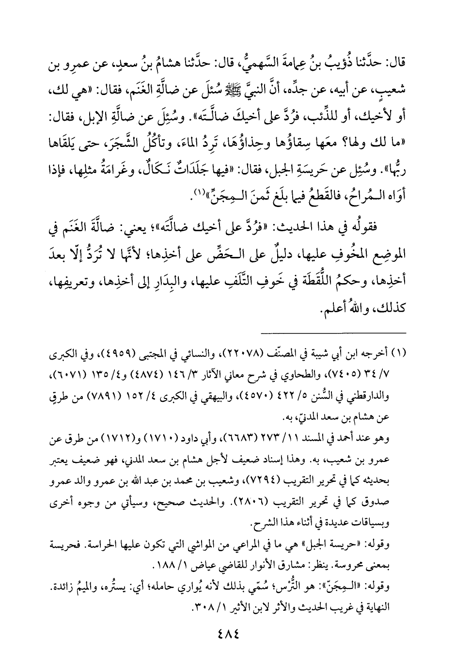 قال: حدَّثنا ذُؤيبُ بنُ عِمامةَ السَّهميُّ، قال: حدَّثنا هشامُ بنُ سعدٍ، عن عمرِو بن شعيبٍ، عن أبيه، عن جدِّه، أنَّ النبيَّ - صلى الله عليه وسلم - سُئلَ عن ضالَّةِ الغَنَم، فقال: "هي لك، أو لأخيك، أو للذِّئب، فرُدَّ على أخيكَ ضالَّتَه". وسُئِلَ عن ضالَّةِ الإبل، فقال: "ما لك ولها؟ معَها سِقاؤُها وحِذاؤُهَا، تَرِدُ الماءَ، وتأكُلُ الشَّجَرَ، حتى يَلقَاها ربُّها". وسُئِل عن حَريسَةِ الجبل، فقال: "فيها جَلَدَات نَكَالٌ، وغَرامَةُ مثلِها، فإذا أوَاه المُراحُ، فالقَطعُ فيما بلَغ ثَمنَ المِجَنِّ" (¬١).