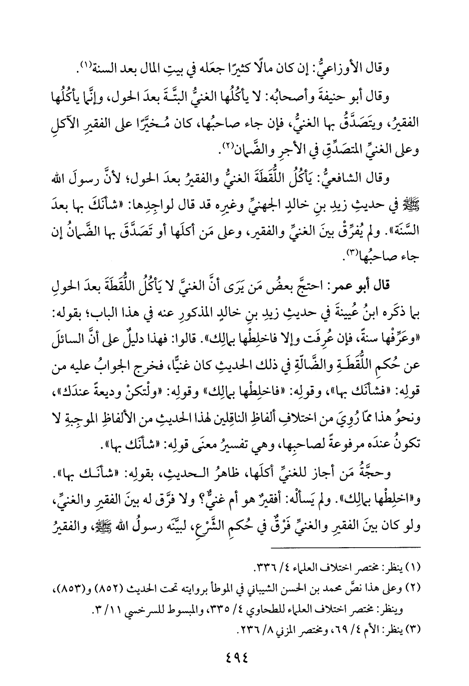 قال أبو عمر: احتجَّ بعضُ مَن يَرَى أنَّ الغنيَّ لا يَأكُلُ اللُّقَطَةَ بعدَ الحولِ بما ذكَره ابنُ عُيينةَ في حديثِ زيدِ بنِ خالدٍ المذكورِ عنه في هذا الباب؛ بقوله: "وعَرِّفْها سنةً، فإن عُرِفَت وإلا فاخلِطْها بمالِك". قالوا: فهذا دليلٌ على أنَّ السائلَ عن حُكمِ اللُّقَطَةِ والضَّالّةِ في ذلك الحديثِ كان غنيًّا، فخرج الجوابُ عليه من قولِه: "فشأنك بها"، وقولِه: "فاخلِطْها بمالِك" وقولِه: "ولْتكنْ وديعةً عندَك"، ونحوُ هذا ممّا رُوِيَ من اختلافِ ألفاظِ الناقِلين لهذا الحديثِ من الألفاظِ الموجِبةِ لا تكونُ عندَه مرفوعةً لصاحبِها، وهي تفسيرُ معنَى قولِه: "شأنك بها".