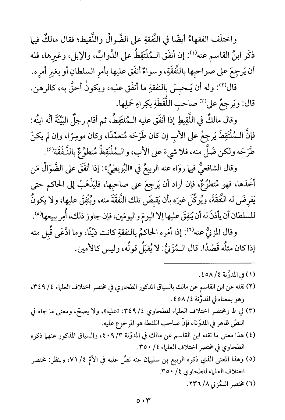 واختلَف الفقهاءُ أيضًا في النَّفقةِ على الضَّوالِّ واللَّقيط؛ فقال مالكٌ فيما ذكَر ابنُ القاسم عنه (¬١): إن أنفَق المُلْتَقِطُ على الدَّوابِّ، والإبل، وغيرِها، فله أن يَرجِعَ على صواحبِها بالنَّفقَةِ، وسواءٌ أنفَق عليها بأمرِ السلطانِ أو بغيرِ أمرِه.
