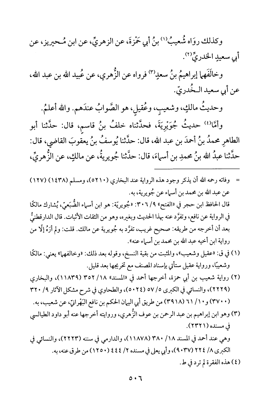 وأمَّا (¬٤) حديثُ جُوَيْرِيَةَ، فحَدَّثَنَاه خلفُ بنُ قاسمٍ، قال: حَدَّثَنَا أبو الطاهرِ محمدُ بنُ أحمدَ بن عبد الله، قال: حَدَّثَنَا يُوسفُ بنُ يعقوبَ القاضي، قال: حَدَّثَنَا عبدُ الله بنُ محمدِ بن أسماءَ، قال: حَدَّثَنَا جُويريةُ، عن مالكٍ، عن الزُّهريِّ،