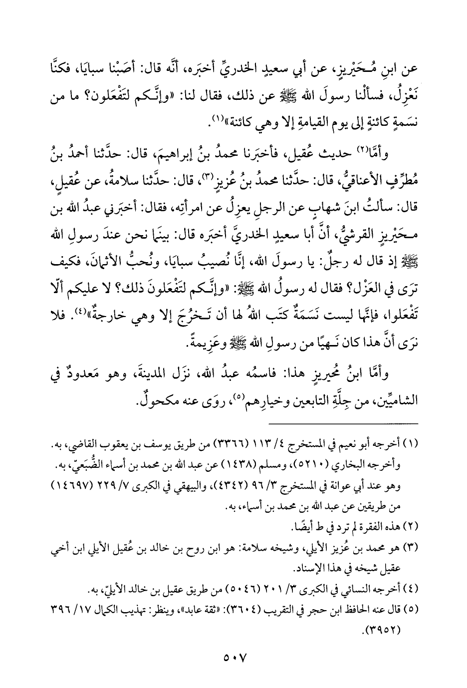 عن ابنِ مُحَيْريزٍ، عن أبي سعيدٍ الخدريِّ أخبَره، أنَّه قال: أصَبْنا سبايَا، فكنَّا نَعْزِلُ، فسألْنا رسولَ الله - صَلَّى اللهُ عَلَيْهِ وَسَلَّمَ - عن ذلك، فقال لنا: "وإنَّكم لتَفْعَلون؟ ما من نسَمةٍ كائنةٍ إلى يوم القيامةِ إلَّا وهي كائنة" (¬١).