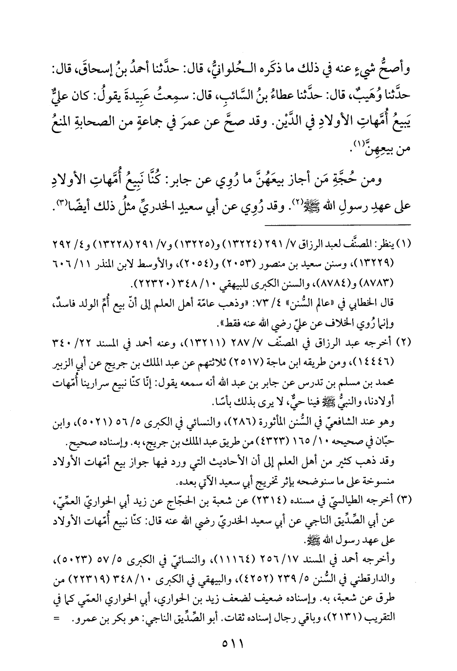 (¬٢) أخرجه عبد الرزاق في المصنّف ٧/ ٢٨٧ (١٣٢١١)، وعنه أحمد في المسند ٢٢/ ٣٤٠ (١٤٤٤٦)، ومن طريقه ابن ماجة (٢٥١٧) ثلاثتهم عن عبد الملك بن جريجٍ عن أبي الزبير محمد بن مسلم بن تدرس عن جابر بن عبد الله أنه سمعه يقول: إنّا كنّا نبيع سرارينا أُمّهات أولادنا، والنبيُّ - صَلَّى اللهُ عَلَيْهِ وَسَلَّمَ - فينا حيٌّ، لا يرى بذلك بأسًا.