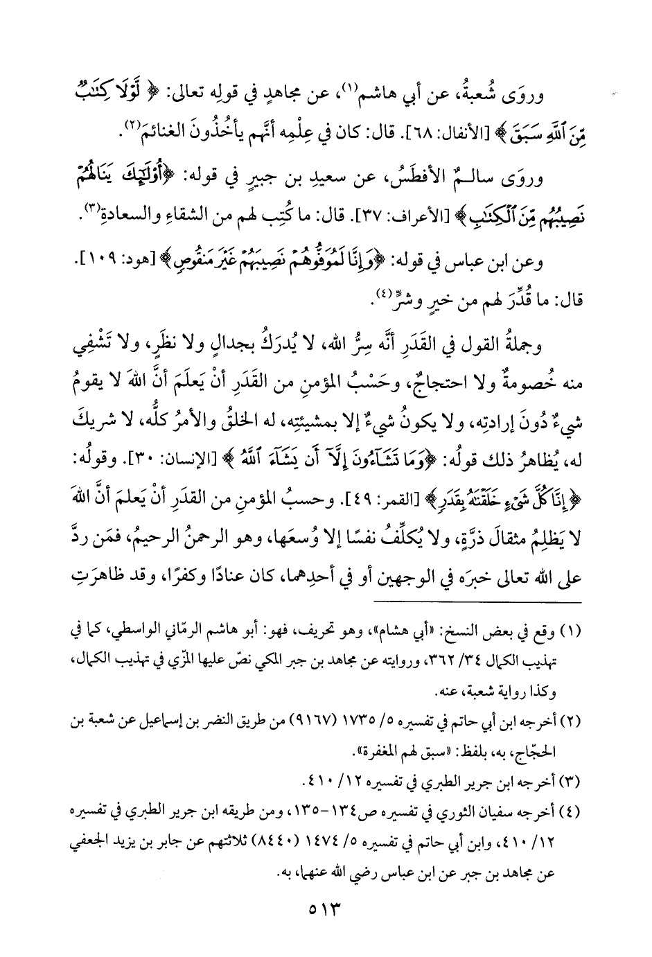 وعن ابن عباس في قوله: {وَإِنَّا لَمُوَفُّوهُمْ نَصِيبَهُمْ غَيْرَ مَنْقُوصٍ} [هود: ١٠٩]. قال: ما قُدِّرَ لهم من خيرٍ وشرٍّ (¬٤).