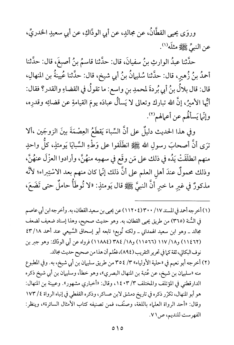 حَدَّثَنَا عبدُ الوارثِ بنُ سفيانَ، قال: حَدَّثَنَا قاسمُ بنُ أصبغَ، قال: حَدَّثَنَا أحمدُ بنُ زُهيرٍ، قالْ حَدَّثَنَا سُليمانُ بنُ أبي شيخ، قال: حَدَّثَنَا عُيينةُ بن المنهالِ، قال: قال بلالُ بنُ أبي بُردةَ لمحمدِ بنِ واسع: ما تقولُ في القضاءِ والقدر؟ فقال: أيُّها الأميرُ، إنَّ الله تبارك وتعالى لا يَسألُ عبادَه يومَ القيامةِ عن قضائِه وقدرِه، وإنّما يَسألهُم عن أعمالهم (¬٢).