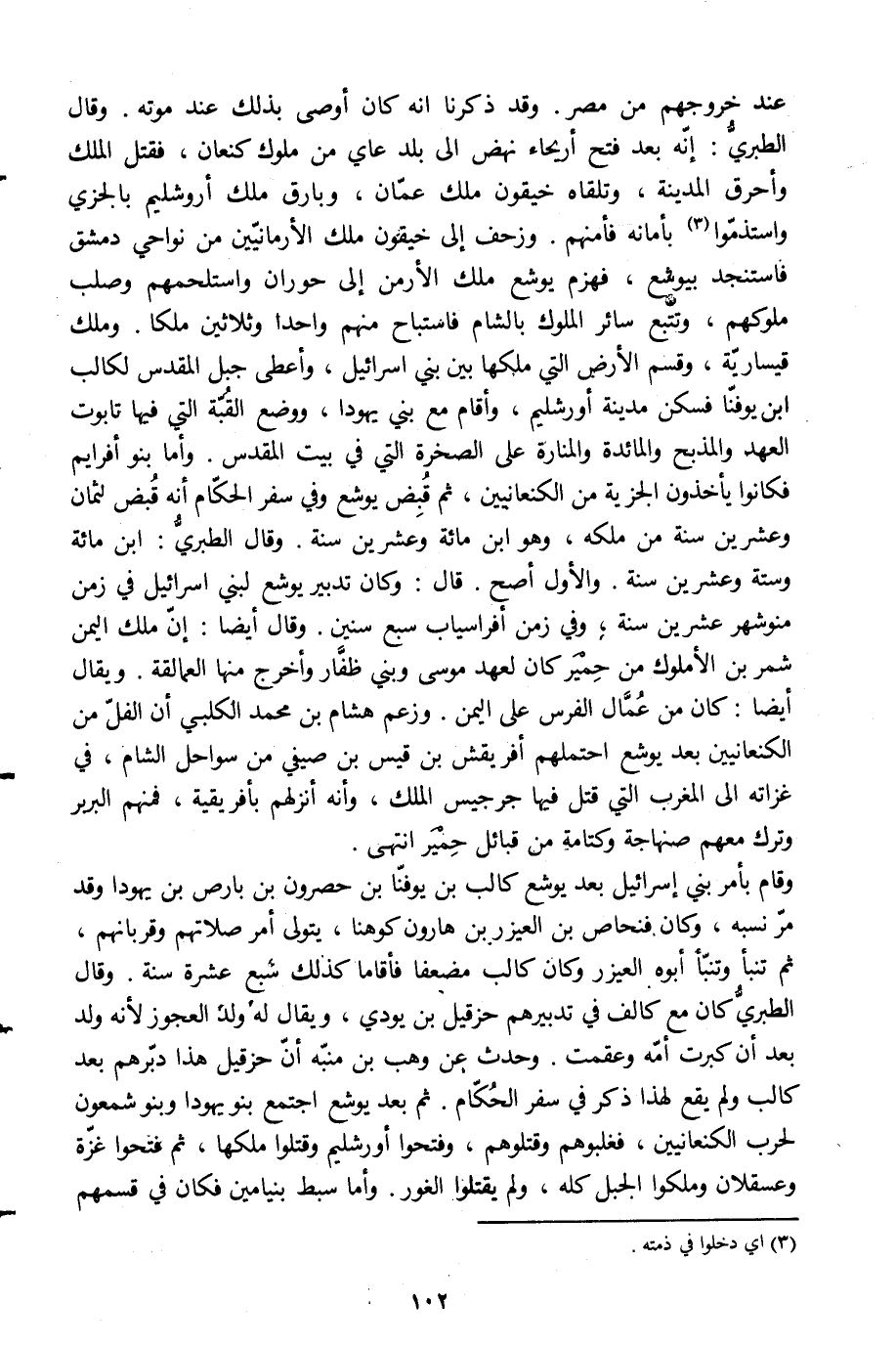 عند خروجهم من مصر. وقد ذكرنا انه كان أوصى بذلك عند موته. وقال الطبريّ: إنّه بعد فتح أريحاء نهض الى بلد عاي من ملوك كنعان، فقتل الملك وأحرق المدينة، وتلقاه خيقون ملك عمّان، وبارق ملك أورشليم بالجزي واستذمّوا [3] بأمانه فأمنهم. وزحف إلى خيقون ملك الأرمانيّين من نواحي دمشق فاستنجد بيوشع، فهزم يوشع ملك الأرمن إلى حوران واستلحمهم وصلب ملوكهم، وتتبع سائر الملوك بالشام فاستباح منهم واحدا وثلاثين ملكا. وملك قيساريّة، وقسم الأرض التي ملكها بين بني إسرائيل، وأعطى جبل المقدس لكالب ابن يوفنّا فسكن مدينة أورشليم، وأقام مع بني يهودا، ووضع القبّة التي فيها تابوت العهد والمذبح والمائدة والمنارة على الصخرة التي في بيت المقدس. وأما بنو أفرايم فكانوا يأخذون الجزية من الكنعانيين، ثم قبض يوشع وفي سفر الحكّام أنه قبض لثمان وعشرين سنة من ملكه، وهو ابن مائة وعشرين سنة. وقال الطبريّ: ابن مائة وستة وعشرين سنة. والأول أصح. قال: وكان تدبير يوشع لبني إسرائيل في زمن منوشهر عشرين سنة، وفي زمن أفراسياب سبع سنين. وقال أيضا: إنّ ملك اليمن شمر بن الأملوك من حمير كان لعهد موسى وبني ظفّار وأخرج منها العمالقة. ويقال أيضا: كان من عمّال الفرس على اليمن. وزعم هشام بن محمد الكلبي أن الفلّ من الكنعانيين بعد يوشع احتملهم أفريقش بن قيس بن صيفي من سواحل الشام، في غزاته الى المغرب التي قتل فيها جرجيس الملك، وأنه أنزلهم بإفريقية، فمنهم البربر وترك معهم صنهاجة وكتامة من قبائل حمير انتهى.
