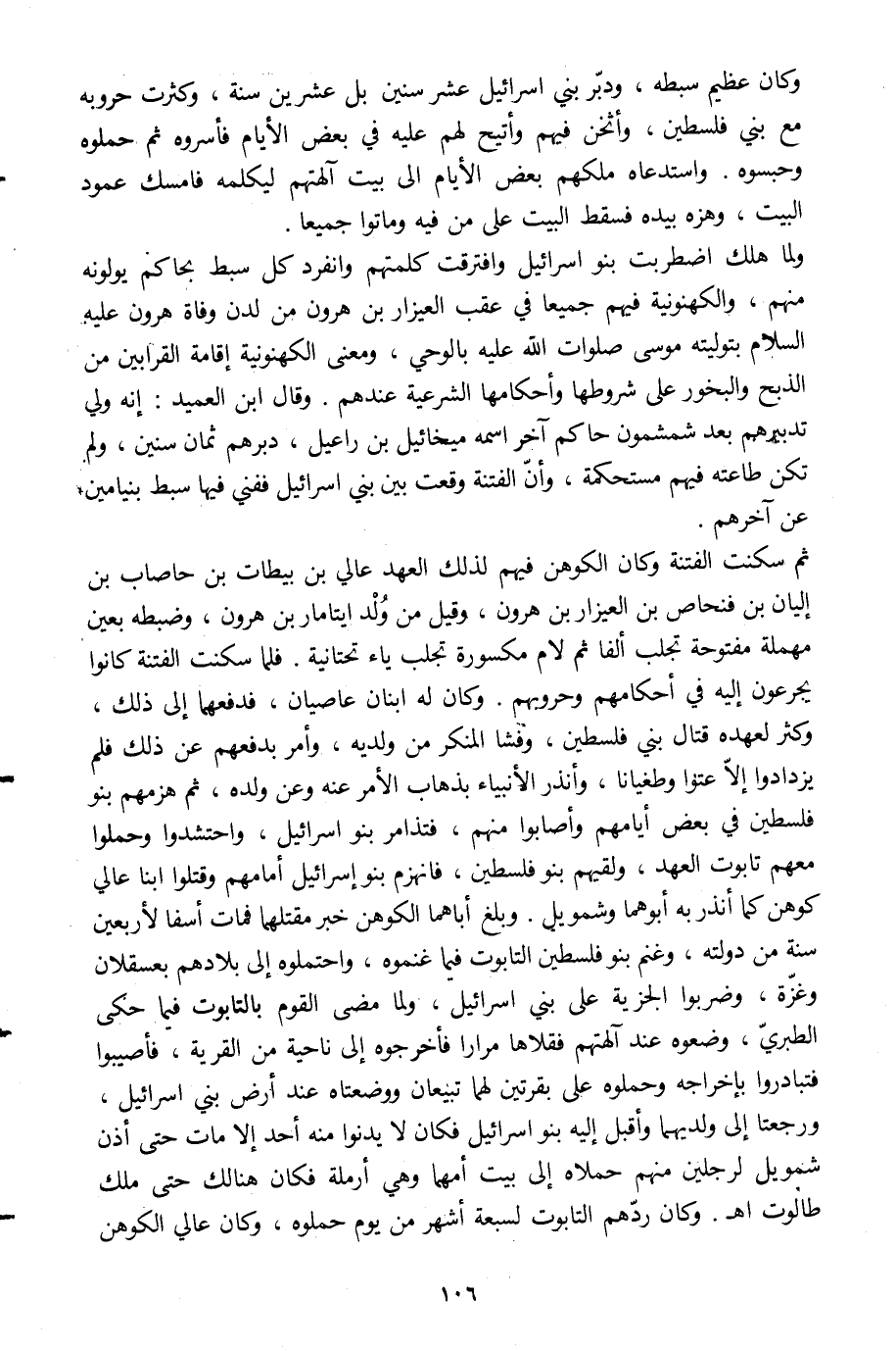 ثم سكنت الفتنة وكان الكوهن فيهم لذلك العهد عالي بن بيطات بن حاصاب بن إليان بن فنحاص بن العيزار بن هارون، وقيل من ولد ايتامار بن هارون، وضبطه بعين مهملة مفتوحة تجلب ألفا ثم لام مكسورة تجلب ياء تحتانية. فلما سكنت الفتنة كانوا يجرعون إليه في أحكامهم وحروبهم. وكان له ابنان عاصيان، فدفعهما إلى ذلك، وكثر لعهده قتال بني فلسطين، وفشا المنكر من ولديه، وأمر بدفعهم عن ذلك فلم يزدادوا إلّا عتوا وطغيانا، وأنذر الأنبياء بذهاب الأمر عنه وعن ولده، ثم هزمهم بنو فلسطين في بعض أيامهم وأصابوا منهم، فتذامر بنو إسرائيل، واحتشدوا وحملوا معهم تابوت العهد، ولقيهم بنو فلسطين، فانهزم بنو إسرائيل أمامهم وقتلوا ابنا عالي كوهن كما أنذر به أبو هما وشمويل. وبلغ أبا هما الكوهن خبر مقتلهما فمات أسفا لأربعين سنة من دولته، وغنم بنو فلسطين التابوت فيما غنموه، واحتملوه إلى بلادهم بعسقلان وغزّة، وضربوا الجزية على بني إسرائيل، ولما مضى القوم بالتابوت فيما حكى الطبريّ، وضعوه عند آلهتهم فقلاها مرارا فأخرجوه إلى ناحية من القرية، فأصيبوا فتبادروا بإخراجه وحملوه على بقرتين لهما تبيعان ووضعتاه عند أرض بني إسرائيل، ورجعتا إلى ولديهما وأقبل إليه بنو إسرائيل فكان لا يدنوا منه أحد إلا مات حتى أذن شمويل لرجلين منهم حملاه إلى بيت أمهما وهي أرملة فكان لك حتى ملك طالوت أهـ. وكان ردّهم التابوت لسبعة أشهر من يوم حملوه، وكان عالي الكوهن