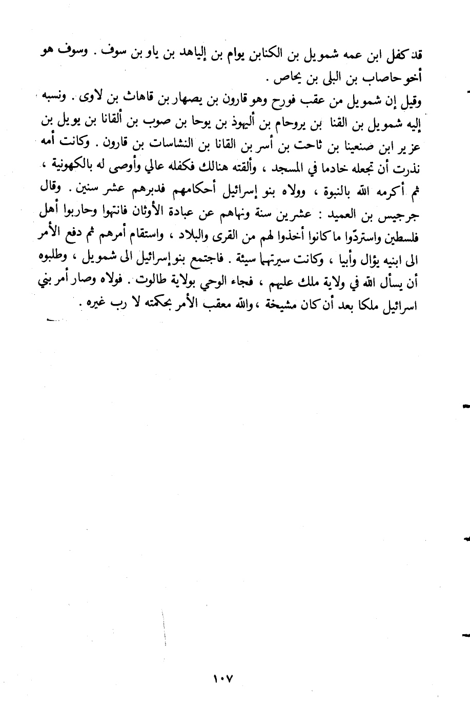 وقيل إن شمويل من عقب فورح وهو قارون بن يصهار بن قاهاث بن لاوى. ونسبه إليه شمويل بن الفنا بن يروحام بن اليهوذ بن يوحا بن صوب بن ألقافا بن يويل بن عزير ابن صنعينا بن ثاحت بن أسر بن القانا بن النشاسات بن قارون. وكانت أمه نذرت أن تجعله خادما في المسجد، وألقته لك فكفله عالي وأوصى له بالكهونية، ثم أكرمه الله بالنّبوّة، وولاه بنو إسرائيل أحكامهم فدبرهم عشر سنين. وقال جرجيس بن العميد: عشرين سنة ونهاهم عن عبادة الأوثان فانتهوا وحاربوا أهل فلسطين واستردّوا ما كانوا أخذوا لهم من القرى والبلاد، واستقام أمرهم ثم دفع الأمر الى ابنيه يؤال وأبيا، وكانت سيرتهما سيئة. فاجتمع بنو إسرائيل الى شمويل، وطلبوه أن يسأل الله في ولاية ملك عليهم، فجاء الوحي بولاية طالوت. فولاه وصار أمر بني إسرائيل ملكا بعد أن كان مشيخة، والله معقب الأمر بحكمته لا رب غيره.