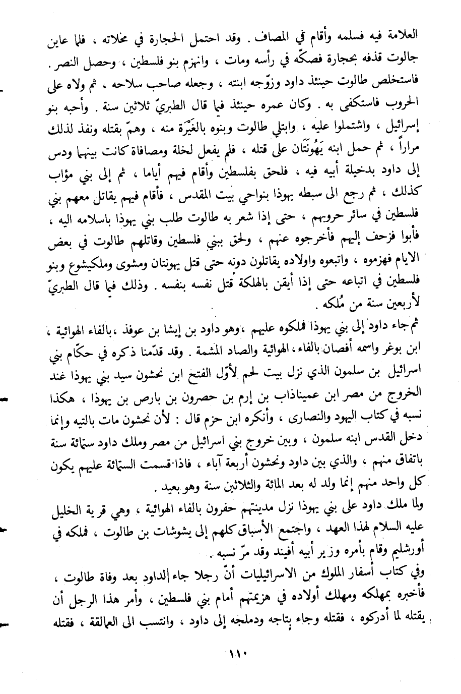 ثم جاء داود إلى بني يهوذا فملكوه عليهم، وهو داود بن إيشا بن عوفذ، بالفاء الهوائية، ابن بوغر واسمه أفصان بالفاء، الهوائية والصاد المشمة. وقد قدّمنا ذكره في حكّام بني إسرائيل بن سلمون الّذي نزل بيت لحم لأوّل الفتح ابن نحشون سيد بني يهوذا عند الخروج من مصر ابن عميناذاب بن إرم بن حصرون بن بارص بن يهوذا، هكذا نسبه في كتاب اليهود والنصارى، وأنكره ابن حزم قال: لأن نحشون مات بالتيه وإنما دخل القدس ابنه سلمون، وبين خروج بني إسرائيل من مصر وملك داود ستمائة سنة باتفاق منهم، والّذي بين داود ونحشون أربعة آباء، فإذا قسمت الستمائة عليهم يكون كل واحد منهم إنما ولد له بعد المائة والثلاثين سنة وهو بعيد.