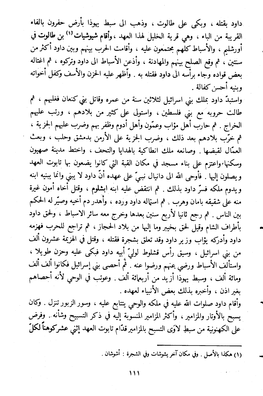 داود بقتله، وبكى على طالوت، وذهب الى سبط يهوذا بأرض حفرون بالفاء القريبة من الباء، وهي قرية الخليل لهذا العهد، وأقام شيوشيات [1] بن طالوت في أورشليم، والأسباط كلهم مجتمعون عليه، وأقامت الحرب بينهم وبين داود أكثر من سنتين، ثم وقع الصلح بينهم والمهادنة، وأذعن الأسباط الى داود وتركوه، ثم اغتاله بعض قواده وجاء برأسه الى داود فقتله به. وأظهر عليه الحزن والأسف وكفل أخواته وبنيه أحسن كفالة.