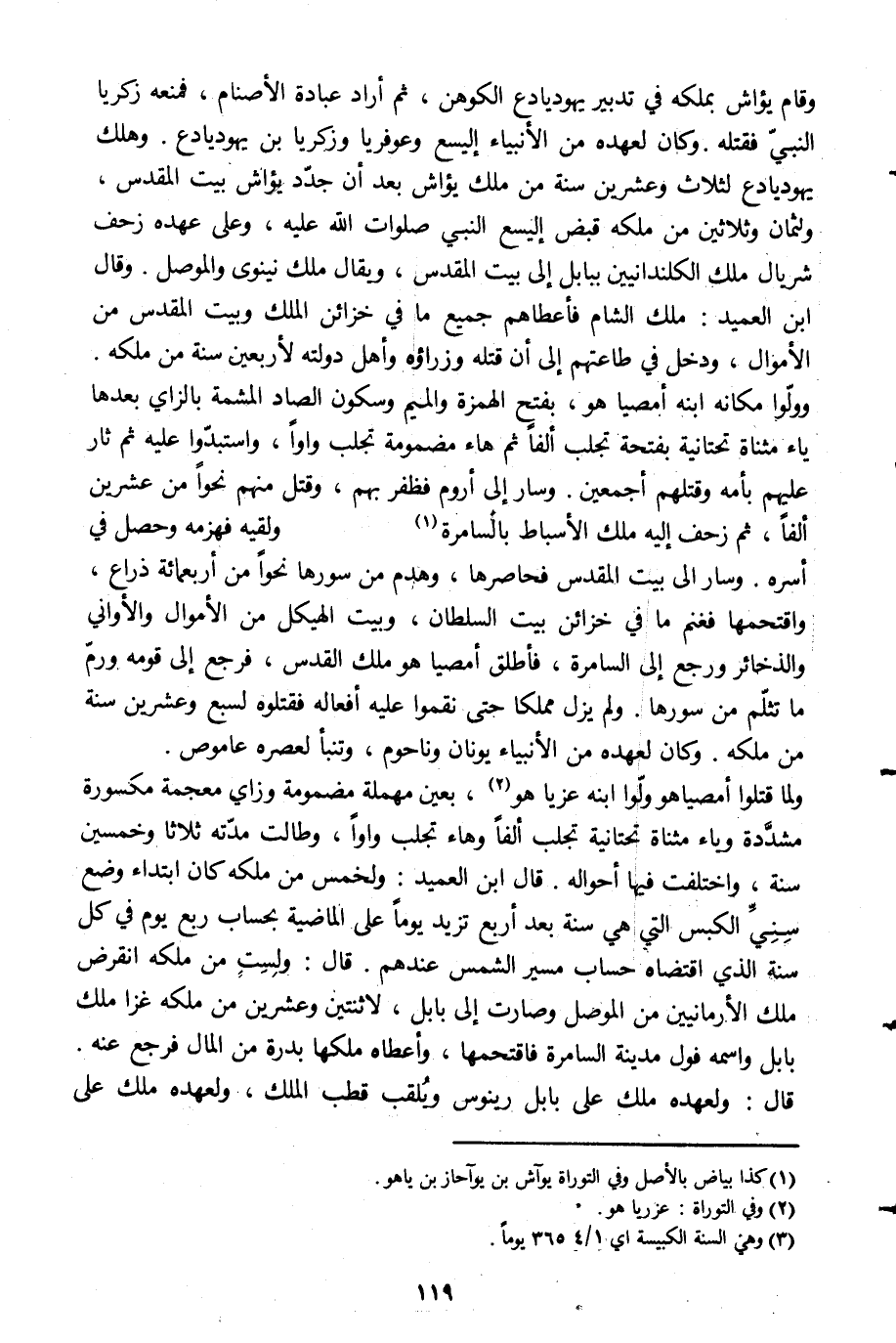 ولما قتلوا أمصيا هو ولّوا ابنه عزيا هو [2] ، بعين مهملة مضمومة وزاي معجمة مكسورة مشدّدة وياء مثناة تحتانية تجلب ألفا وهاء تجلب واوا، وطالت مدّته ثلاثا وخمسين سنة، واختلفت فيها أحواله. قال ابن العميد: ولخمس من ملكه كان ابتداء وضع سنيّ الكبس [3] التي هي سنة بعد أربع تزيد يوما على الماضية بحساب ربع يوم في كل سنة الّذي اقتضاه حساب مسير الشمس عندهم. قال: ولست من ملكه انقرض ملك الأرمانيين من الموصل وصارت إلى بابل، لاثنتين وعشرين من ملكه غزا ملك بابل واسمه فول مدينة السامرة فاقتحمها، وأعطاه ملكها بدرة من المال فرجع عنه.