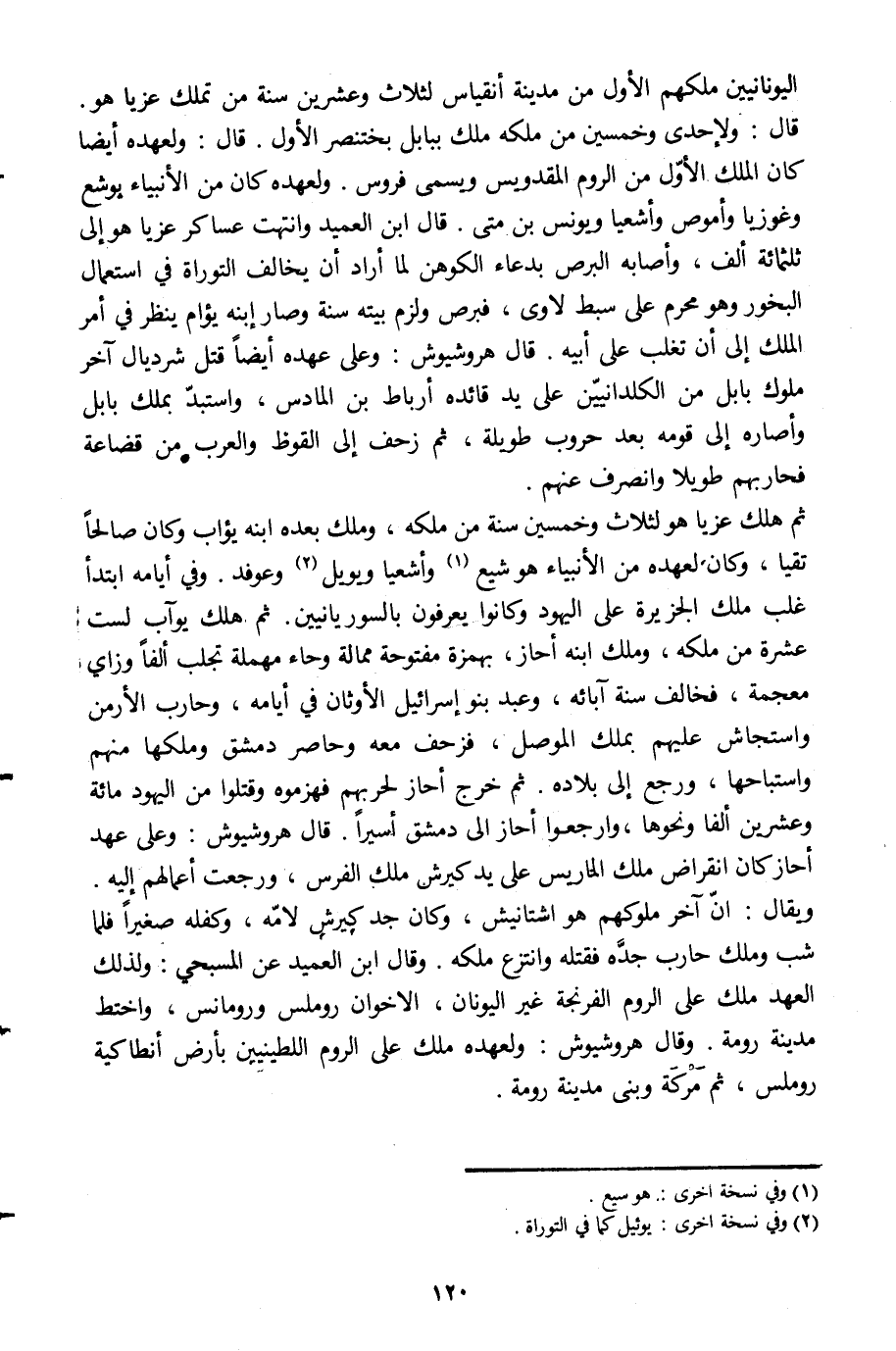 قال: ولإحدى وخمسين من ملكه ملك ببابل بخت نصّر الأول. قال: ولعهده أيضا كان الملك الأوّل من الروم المقدويس ويسمى فروس. ولعهده كان من الأنبياء يوشع وغوزيا وأموص وأشعيا ويونس بن متى. قال ابن العميد وانتهت عساكر عزيا هو إلى ثلاثمائة ألف، وأصابه البرص بدعاء الكوهن لما أراد أن يخالف التوراة في استعمال البخور وهو محرم على سبط لاوى، فبرص ولزم بيته سنة وصار ابنه يؤام ينظر في أمر الملك إلى أن تغلب على أبيه. قال هروشيوش: وعلى عهده أيضا قتل شرديال آخر ملوك بابل من الكلدانيّين على يد قائده أرباط بن المادس، واستبدّ بملك بابل وأصاره إلى قومه بعد حروب طويلة، ثم زحف إلى القوط والعرب من قضاعة فحاربهم طويلا وانصرف عنهم.