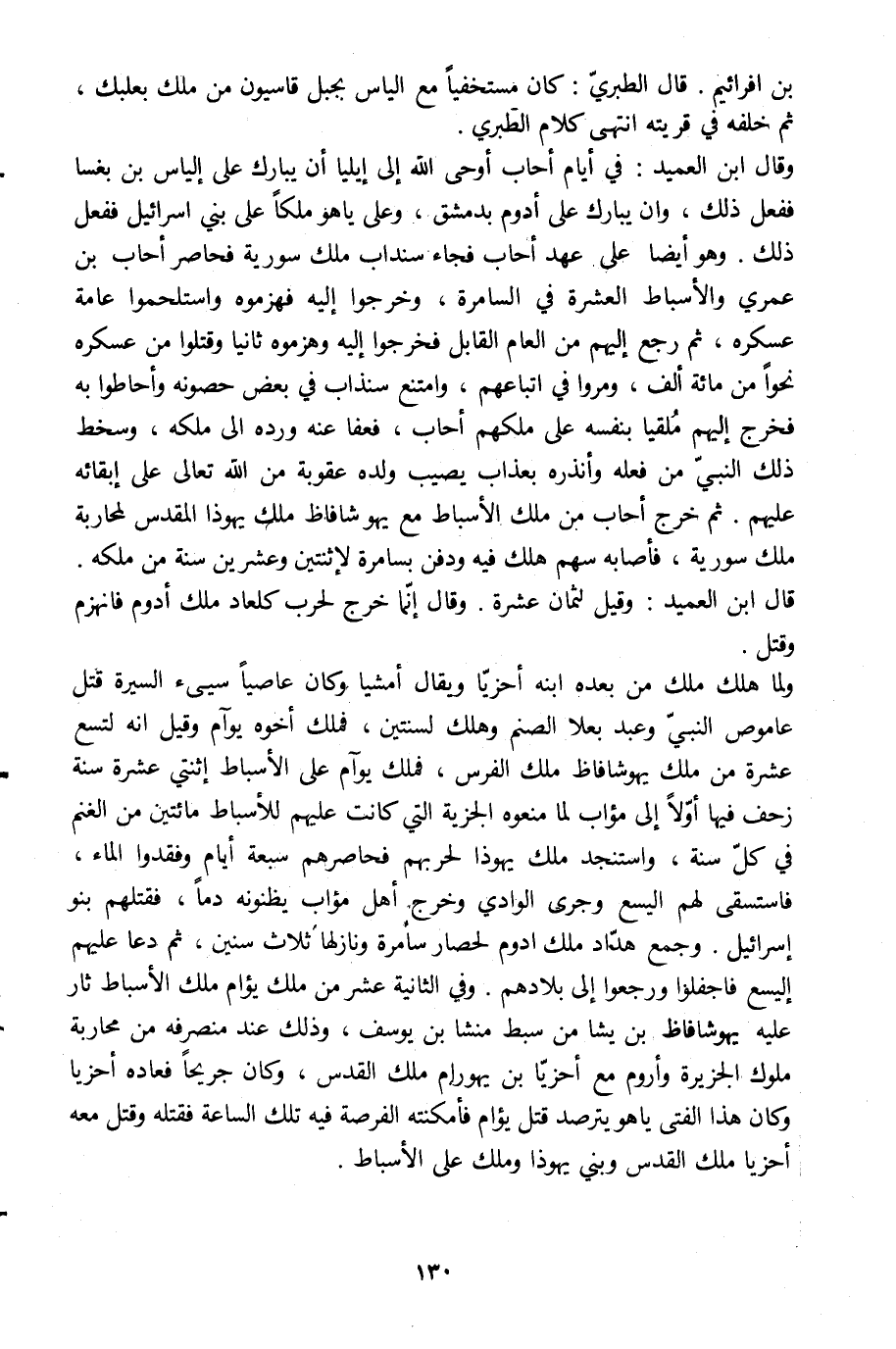 وقال ابن العميد: في أيام أحاب أوحى الله إلى إيليا أن يبارك على إلياس بن بغسا ففعل ذلك، وان يبارك على أدوم بدمشق، وعلى يا هو ملكا على بني إسرائيل ففعل ذلك. وهو أيضا على عهد أحاب فجاء سنداب ملك سورية فحاصر أحاب بن عمري والأسباط العشرة في السامرة، وخرجوا إليه فهزموه واستلحموا عامة عسكره، ثم رجع إليهم من العام القابل فخرجوا إليه وهزموه ثانيا وقتلوا من عسكره نحوا من مائة ألف، ومروا في اتباعهم، وامتنع سنداب في بعض حصونه وأحاطوا به فخرج إليهم ملقيا بنفسه على ملكهم أحاب، فعفا عنه ورده الى ملكه، وسخط ذلك النبيّ من فعله وأنذره بعذاب يصيب ولده عقوبة من الله تعالى على إبقائه عليهم. ثم خرج أحاب من ملك الأسباط مع يهوشافاظ ملك يهوذا المقدس لمحاربة ملك سورية، فأصابه سهم هلك فيه ودفن بسامرة لاثنتين وعشرين سنة من ملكه.